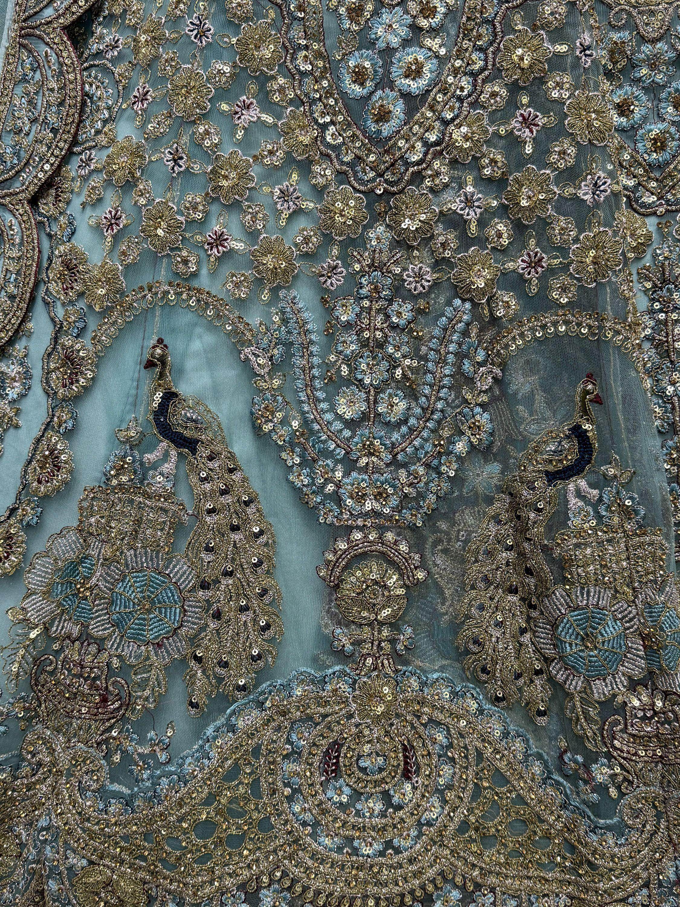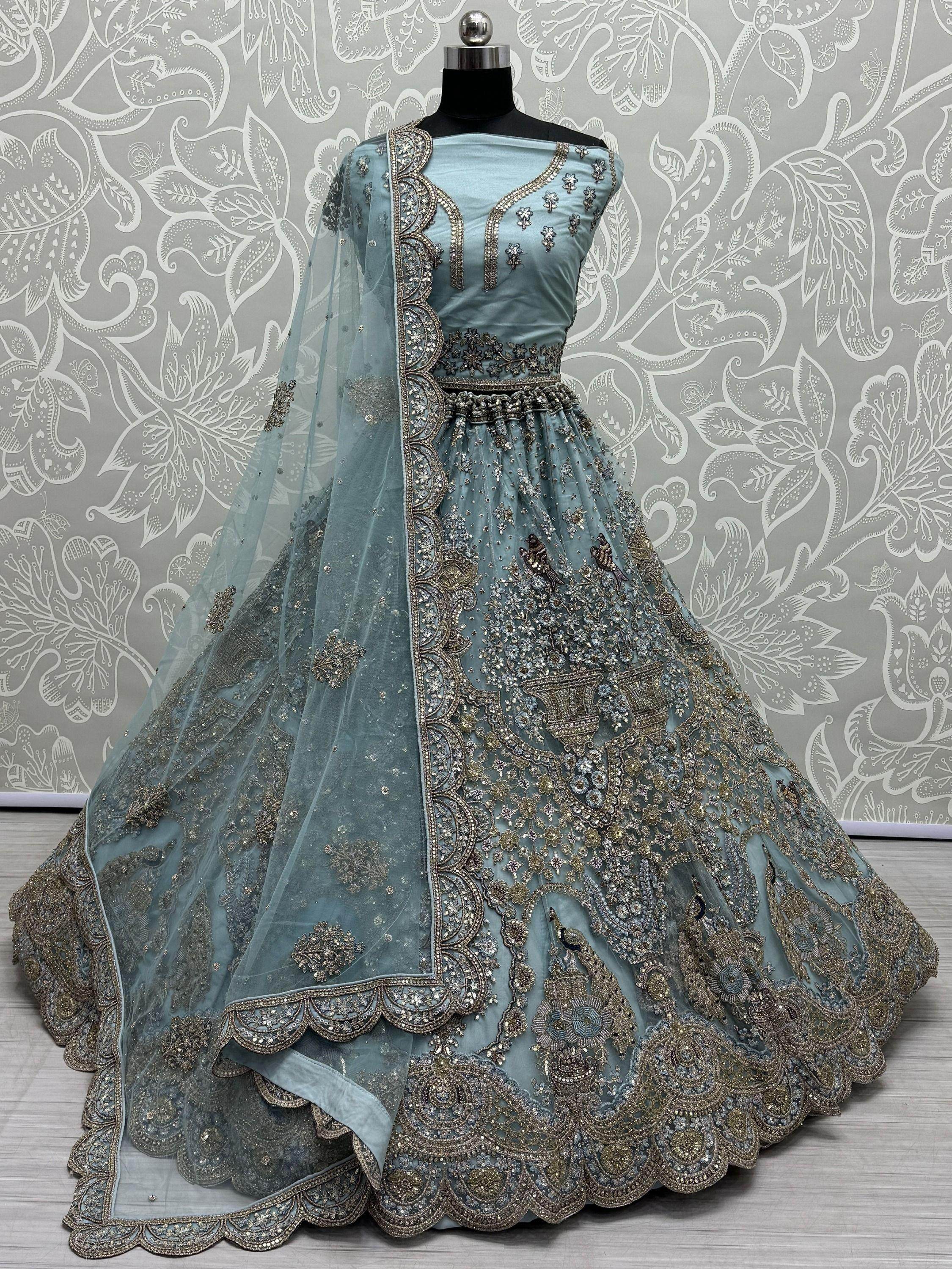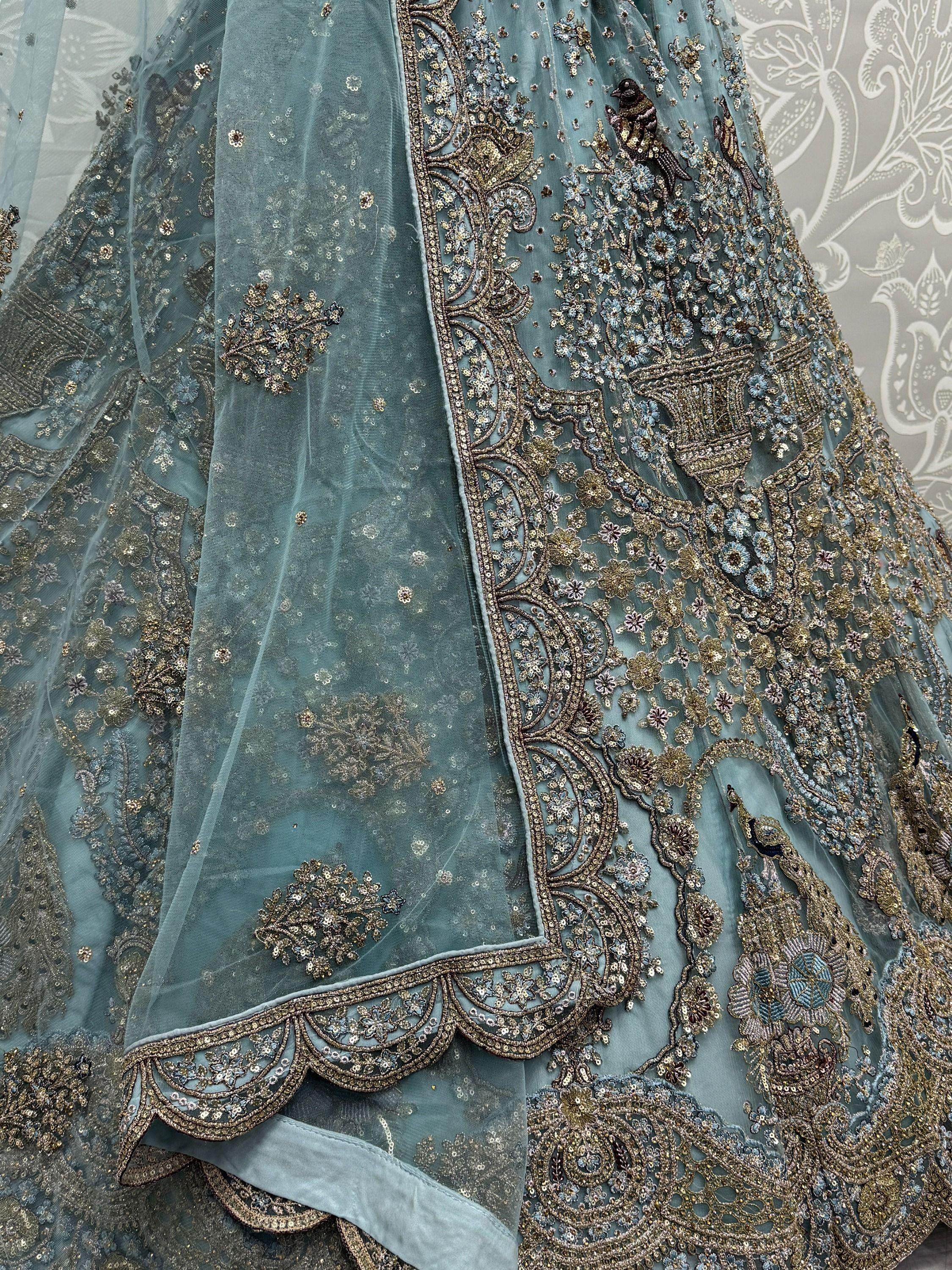 Introducing an ethereal sky-blue lehenga that perfectly blends traditional charm with modern sophistication, ideal for a bridesmaid who wishes to make a memorable impression. This exquisite lehenga is crafted from premium net material and is adorned with intricate zari work, shimmering sequins, delicate dori embroidery, and captivating figure embroidery. Each element of this ensemble is meticulously designed to create a harmonious and breathtaking look.
