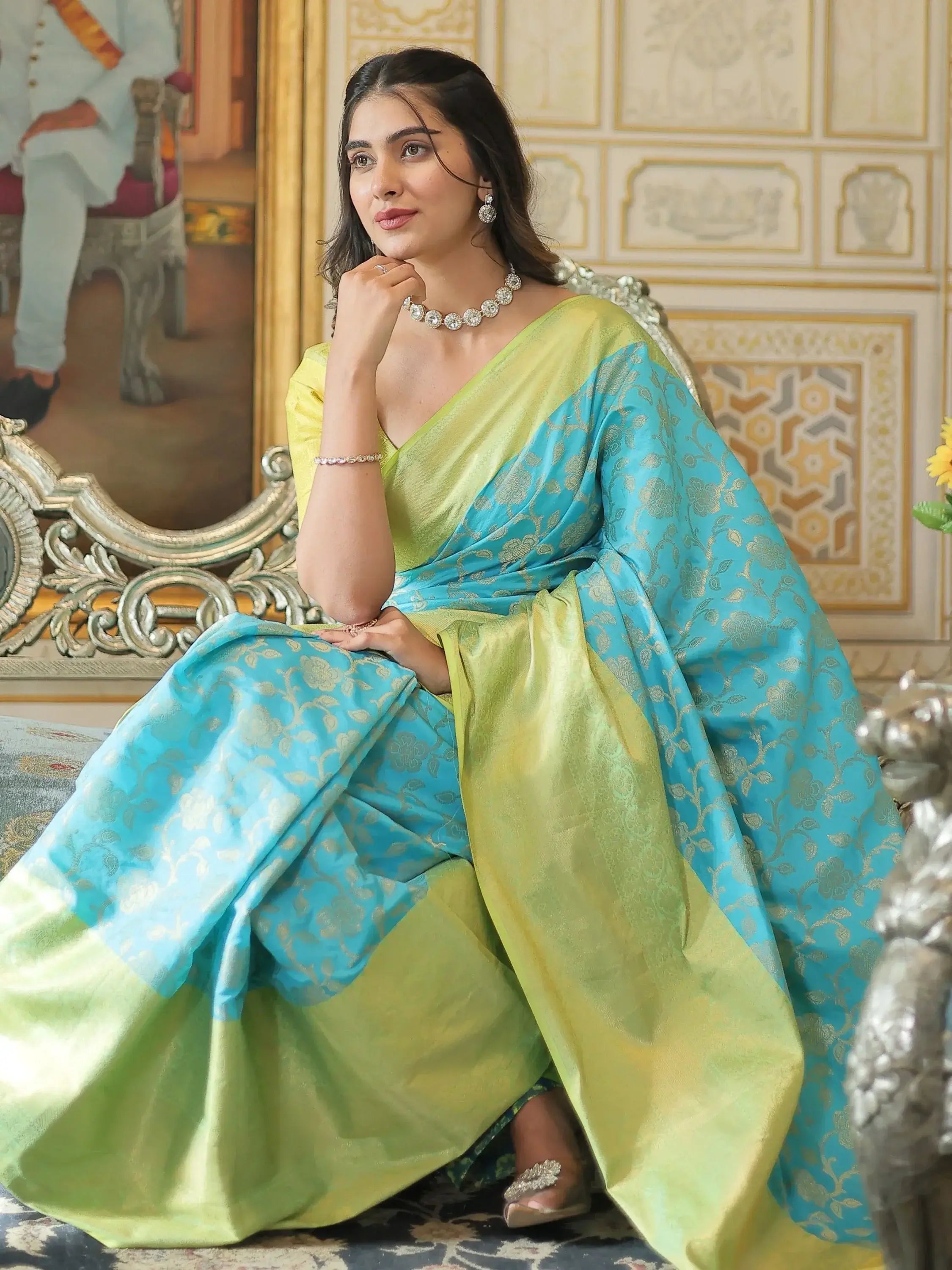 Memorialize your upcoming weddings, events, and any occasion with this beautifully zari-weaving sky-blue saree by giving the proper ethnic look to you. The gorgeous sky-blue zari weaving kanjivaram silk saree with blouse is a stunning ensemble that will make you stand out in the crowd. The sky-blue color saree with intricate zari weaving work exudes elegance and sophistication, while the matching yellow color kanjivaram silk blouse adds a touch of vibrancy to the outfit.