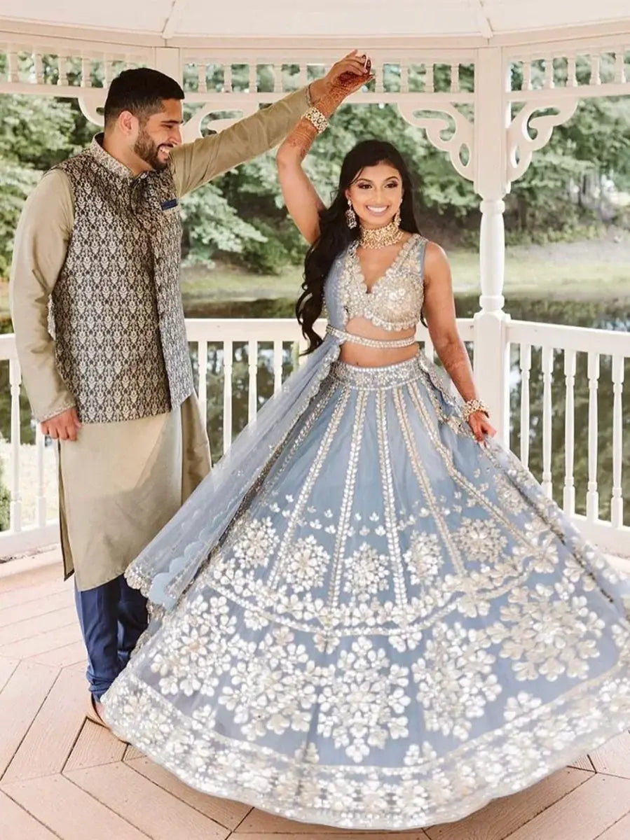 Not only is this lehenga choli beautiful, but it is also practical and easy to care for. We recommend dry cleaning to keep it looking its best. This lehenga choli is not just for weddings and formal occasions; it includes festival wear, evening wear, and cocktail or reception outfits as well. So, whether you're attending a sangeet, engagement, or any other celebration, the Gorgeous Sky Blue Zari Work Net Wedding Wear Lehenga Choli is the perfect choice for you.