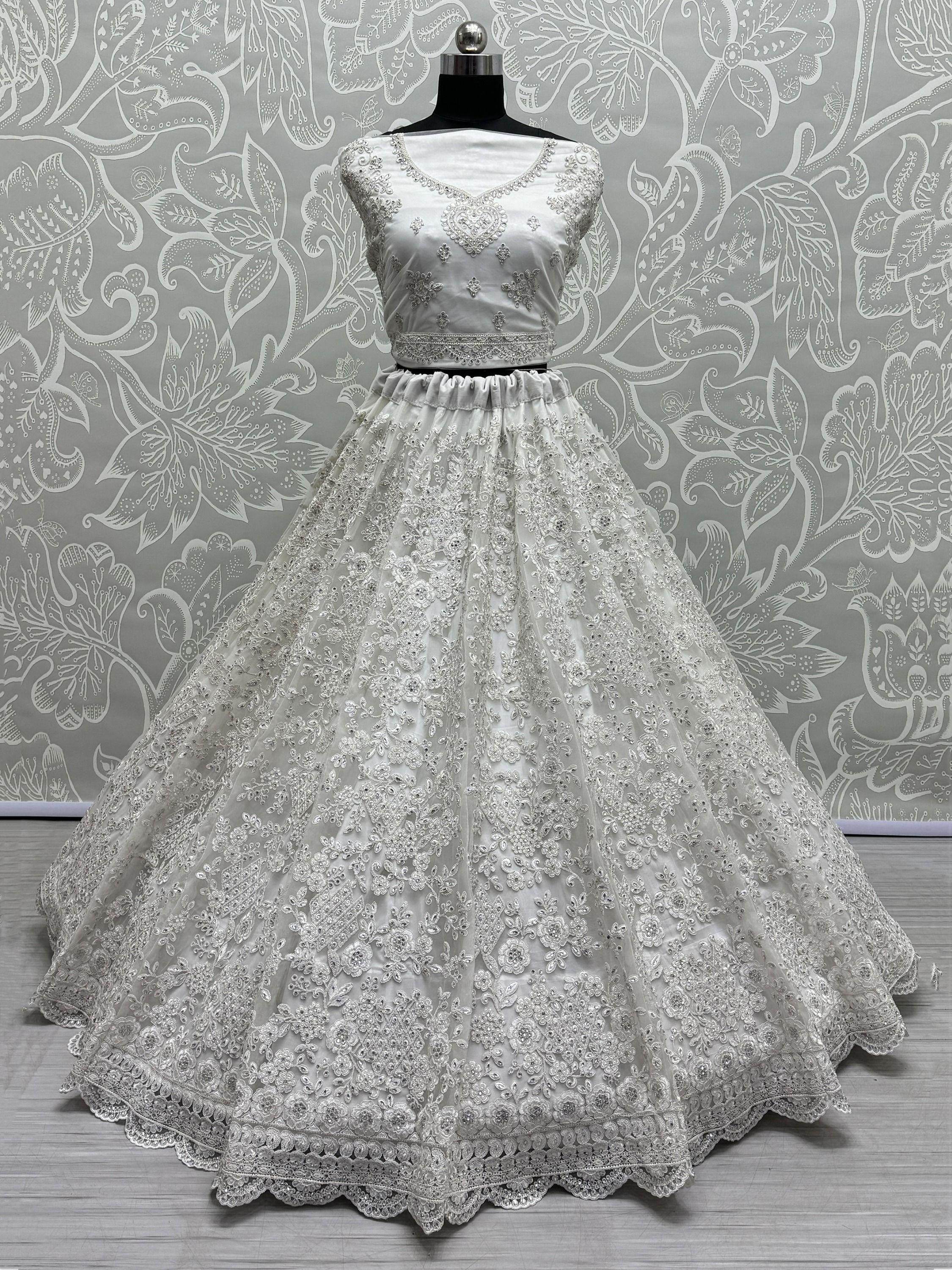 Discover the epitome of elegance with our stunning white net lehenga, adorned with intricate dori-coded work, exquisite thread embroidery, and delicate fancy flower motifs. Each element of this lehenga is meticulously crafted, enhanced by the sparkling zircon embellishments that cascade across the fabric, ensuring you shine with every step. This semi-stitched lehenga can be tailored up to 42 inches, providing a customizable fit that guarantees both comfort and style. Whether for a wedding or a grand celebration, this lehenga will make you the center of attention, radiating a timeless charm.