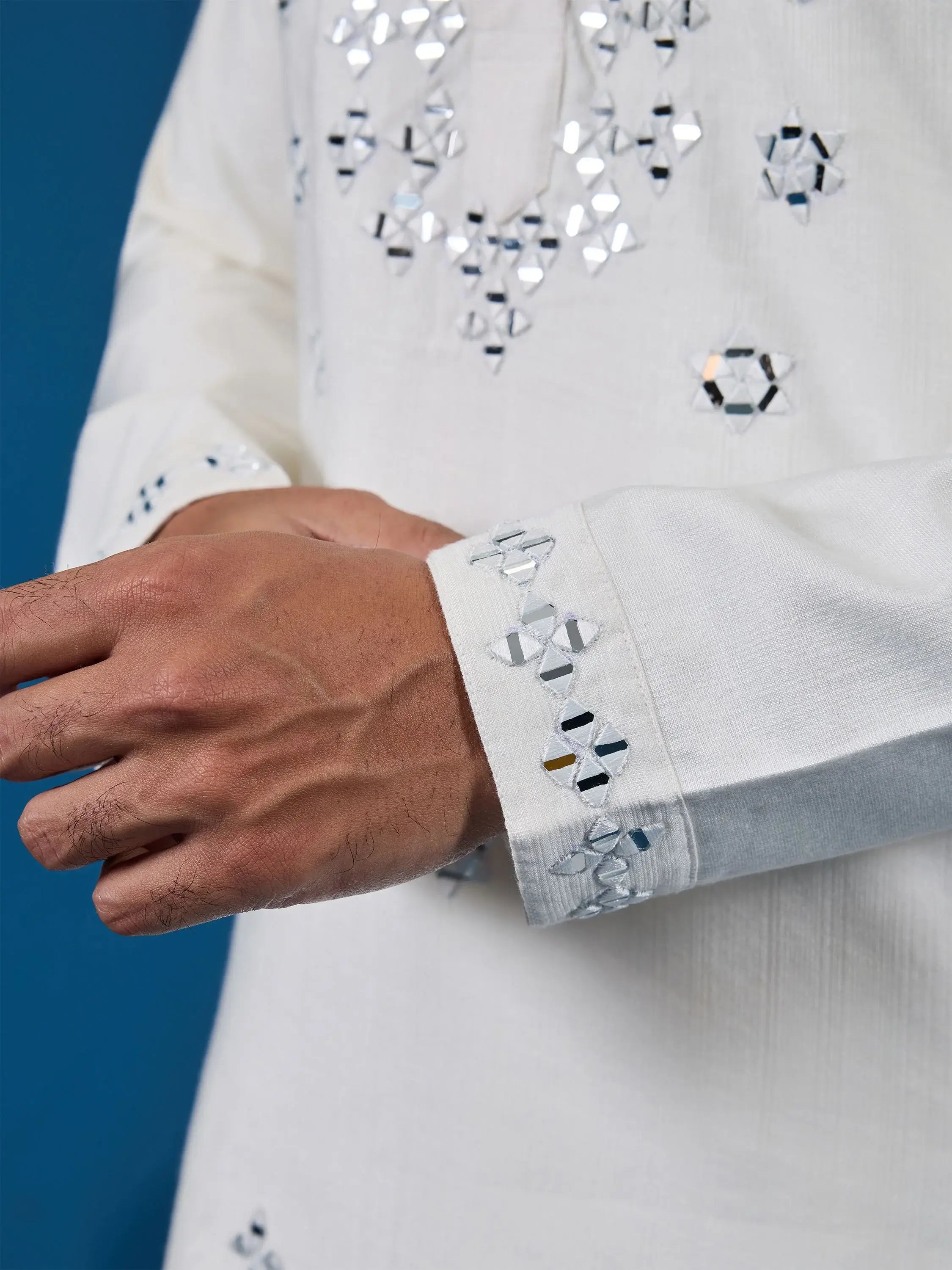 This viscose silk kurta set in a pristine off-white shade exudes elegance and traditional grace. The mirror work detailing across the chest, collar, and cuffs adds a festive sparkle that enhances the kurta’s refined charm.