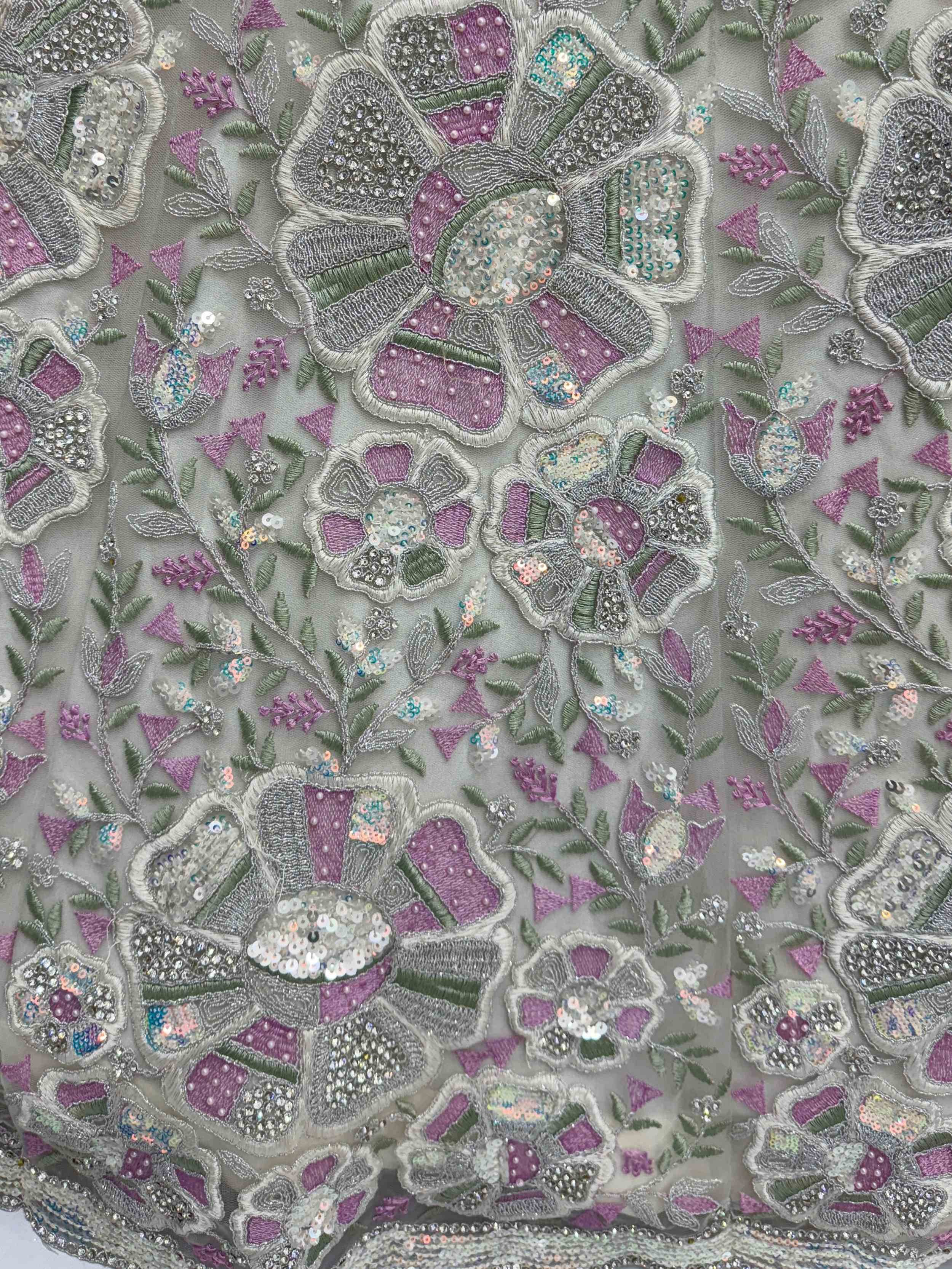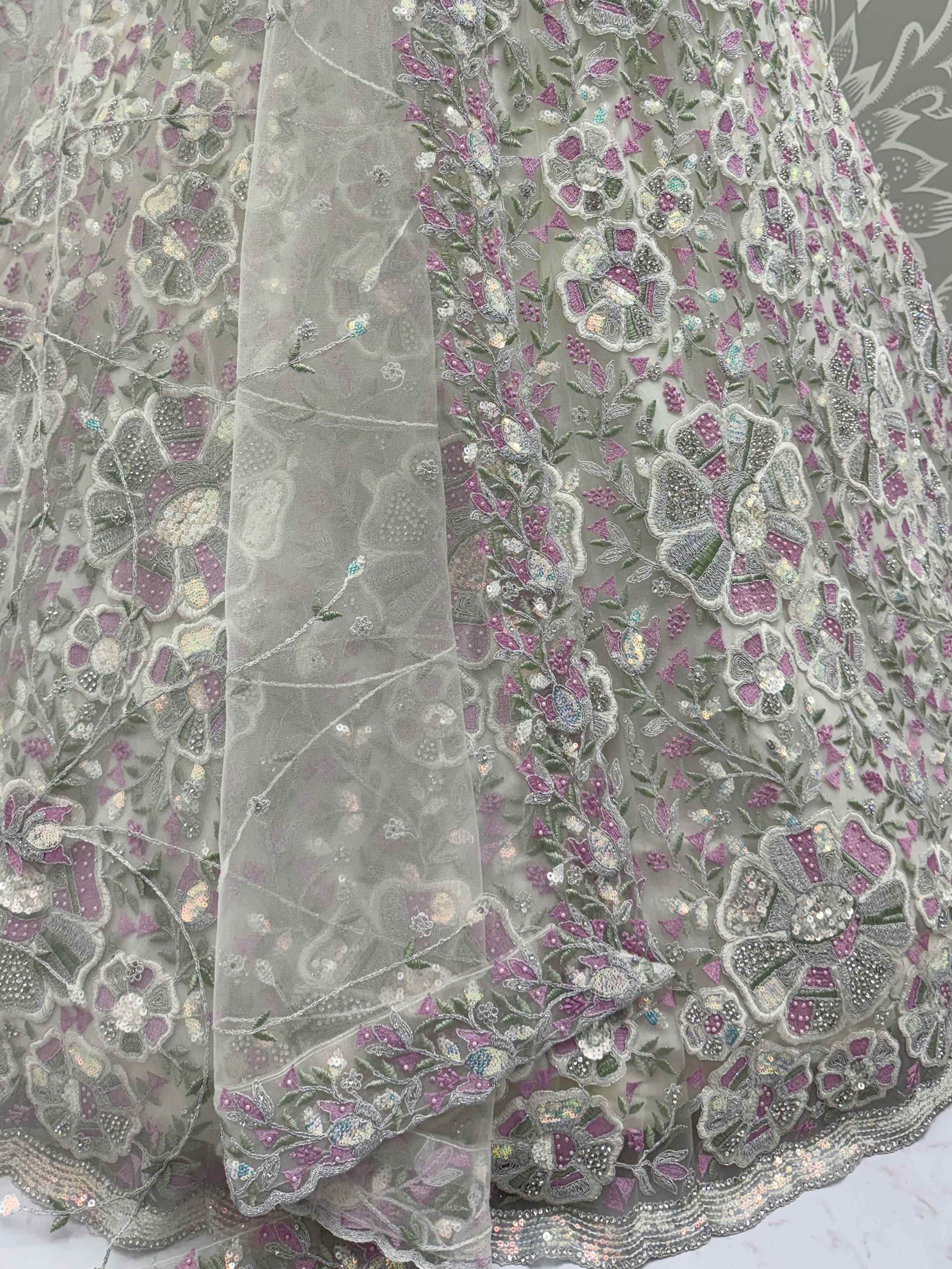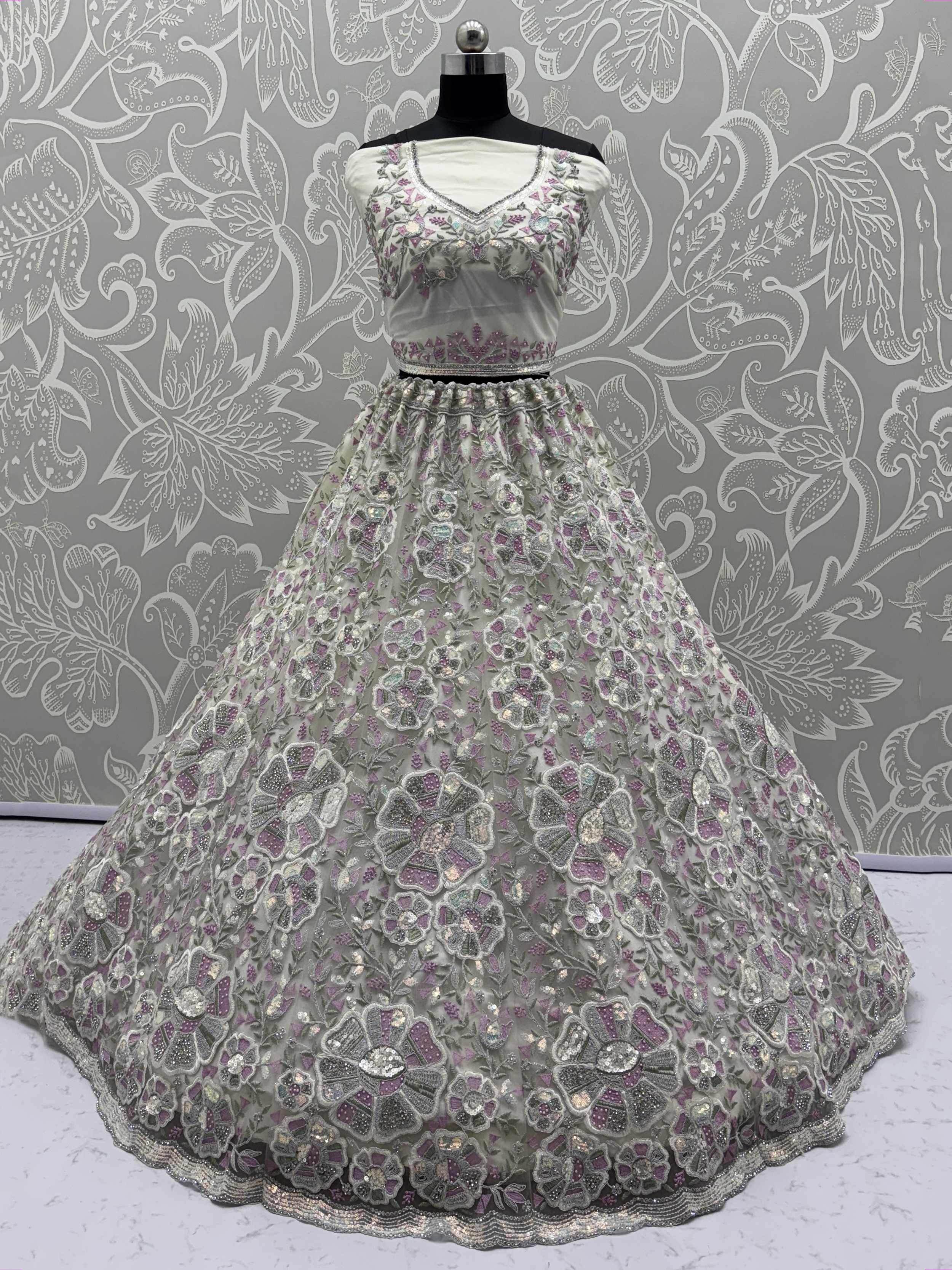 This stunning net lehenga choli is a true statement piece, designed with an exquisite flower embroidery pattern that adds depth and charm. The delicate craftsmanship makes it ideal for weddings and festive occasions.