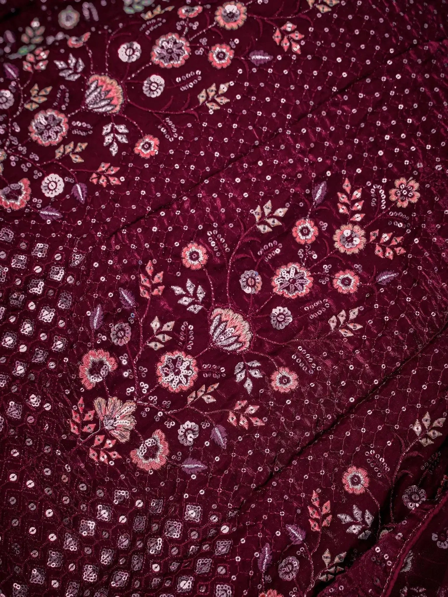 The rich wine color of this lehenga set will surely make heads turn and earn you compliments for your impeccable sense of style. The combination of sequin and thread work adds a touch of glamour and sophistication, making it a perfect choice for bridesmaids or for anyone looking to make a statement at a festive event.