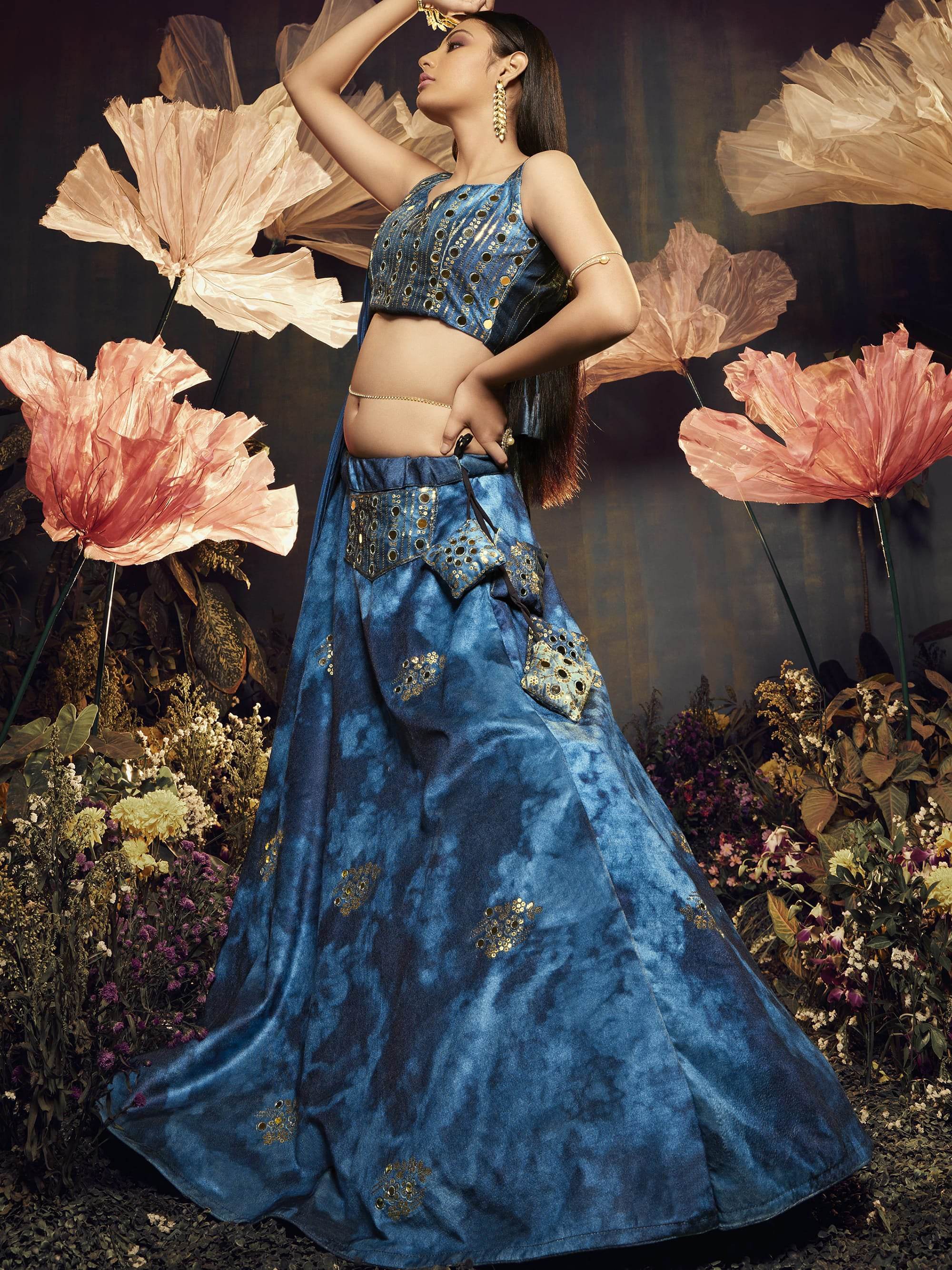 Create an opulent effect with your fashion sense by wearing this elegant blue color lehenga crafted with velvet material finished with sibburi print with sequins embroidery and mirror work and also comes with tassels.