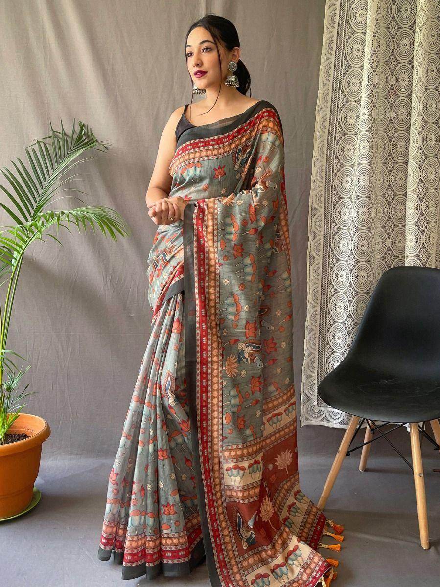 Shop Grey Kalamkari Print Malai Cotton Occasion Saree with Blouse From Ethnic Plus and experience the joy of wearing an outfit that seamlessly combines tradition and modern fashion. With our free shipping, COD available, accessible 7-day return policy, and worldwide shipment, you can enjoy hassle-free shopping. Don't miss out on the latest range of ethnic collections, shop now and grab this all-new arrival.