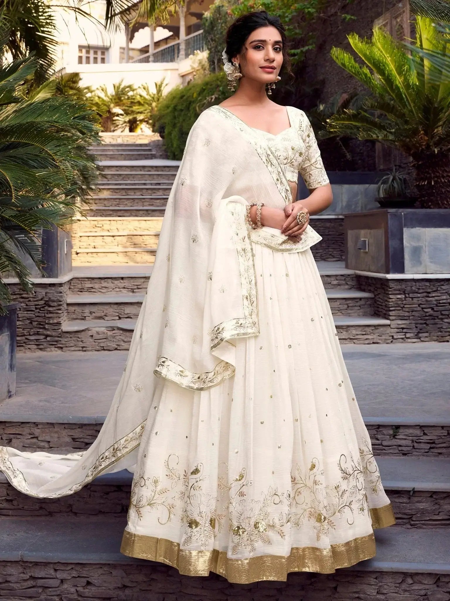 Make a graceful statement at any wedding event with this off-white silk stitched lehenga, designed especially for bridesmaids. Adorned with delicate sequins, fine embroidery, and subtle foil work, it offers an elegant yet festive look that stands out with refined charm. The off-white tone adds a soft, romantic touch—perfect for wedding celebrations.
