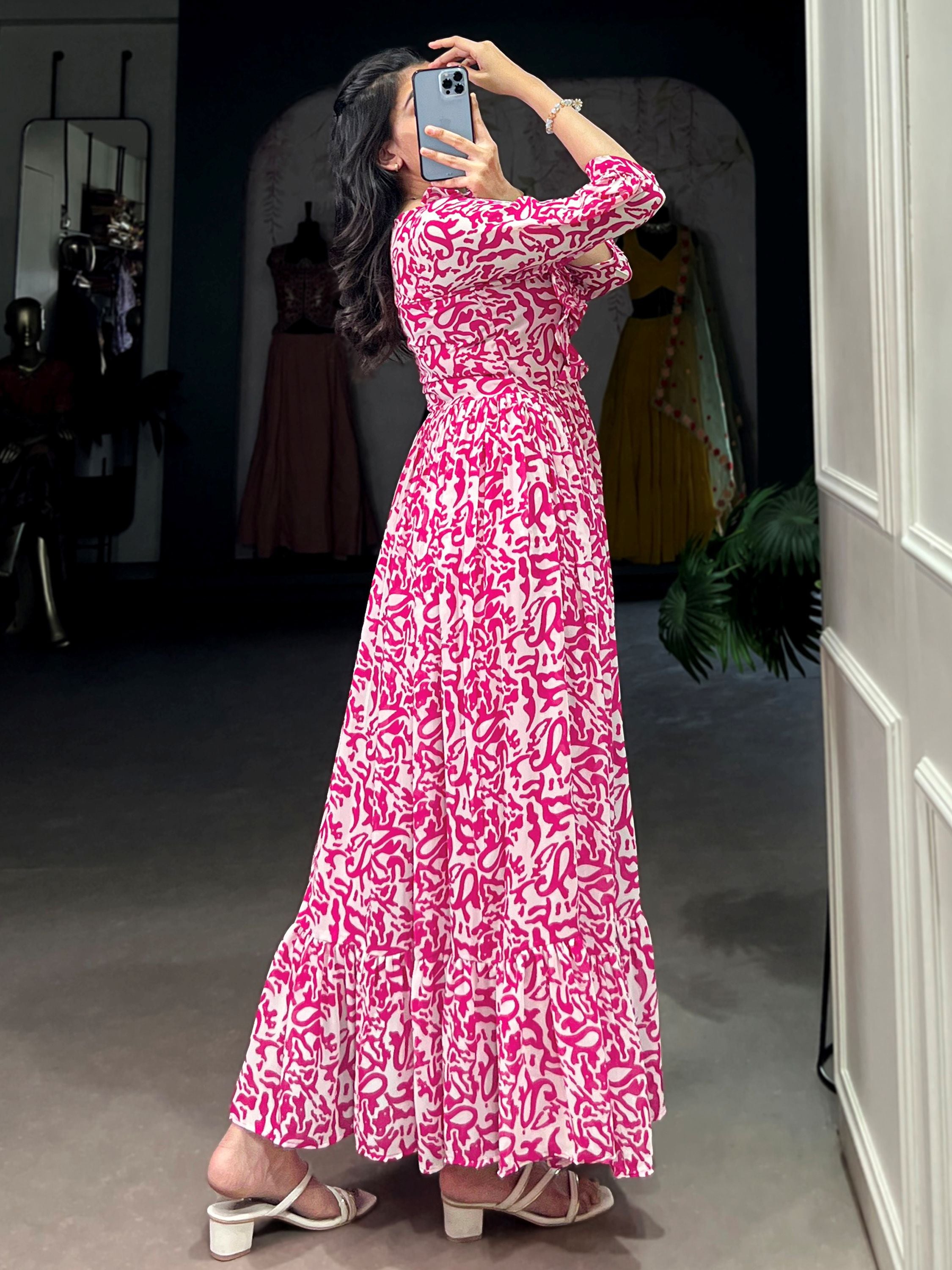 This elegant pink printed georgette frock is a perfect mix of comfort and chic style. The lightweight georgette fabric with abstract prints gives it a breezy and modern look, ideal for casual outings or brunch dates.