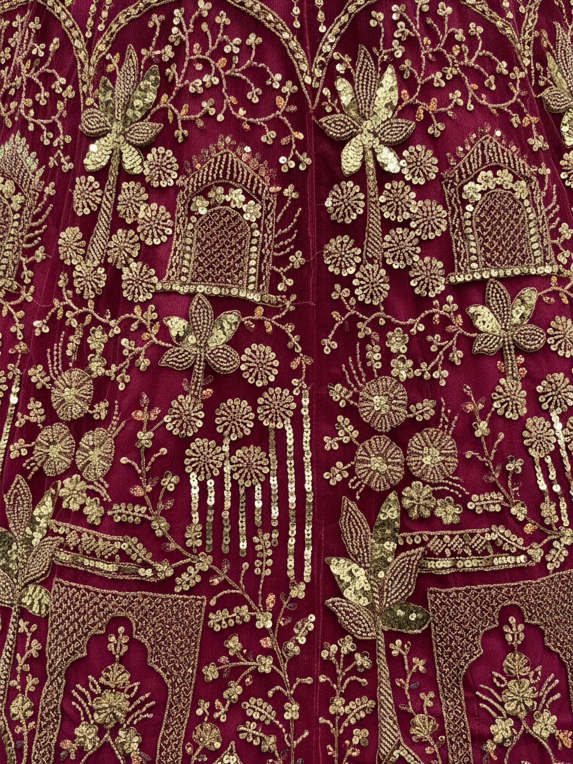 This purple lehenga is a true masterpiece, crafted in rich net fabric with heavy embroidery and intricate sequins work. The semi-stitched lehenga allows for perfect customization, while the flared design enhances its regal appeal. Golden thread and sequin patterns add a luxurious charm, making it ideal for weddings and festive occasions.