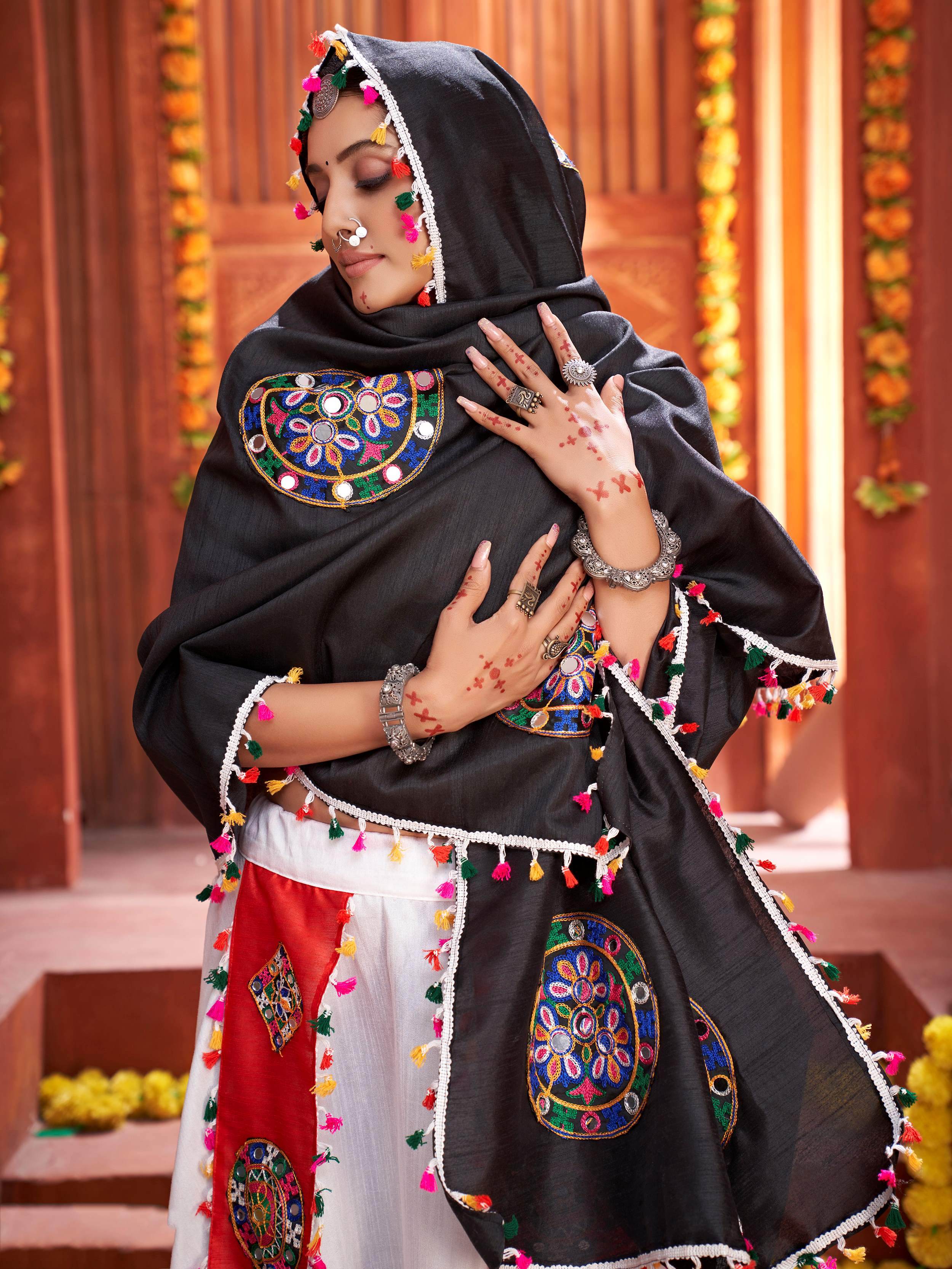 Paired with a similar color round shape neck design and half sleeve adorable silk fabric choli decorated with pach butta and all-over real mirror work and black color silk fabric dupatta attached with colorful tassels (2.3 mtr).