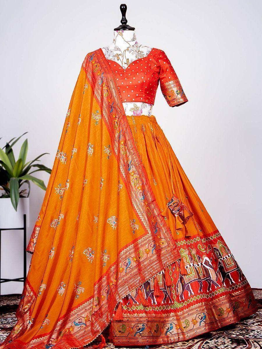 Sensible colors excellent designs and traditional moods are reflected with an alluring style. Be your style icon with captivating orange color dola silk designer lehenga choli with a cocktail of paithani and patola on the attire adds a sign beauty statement to your look