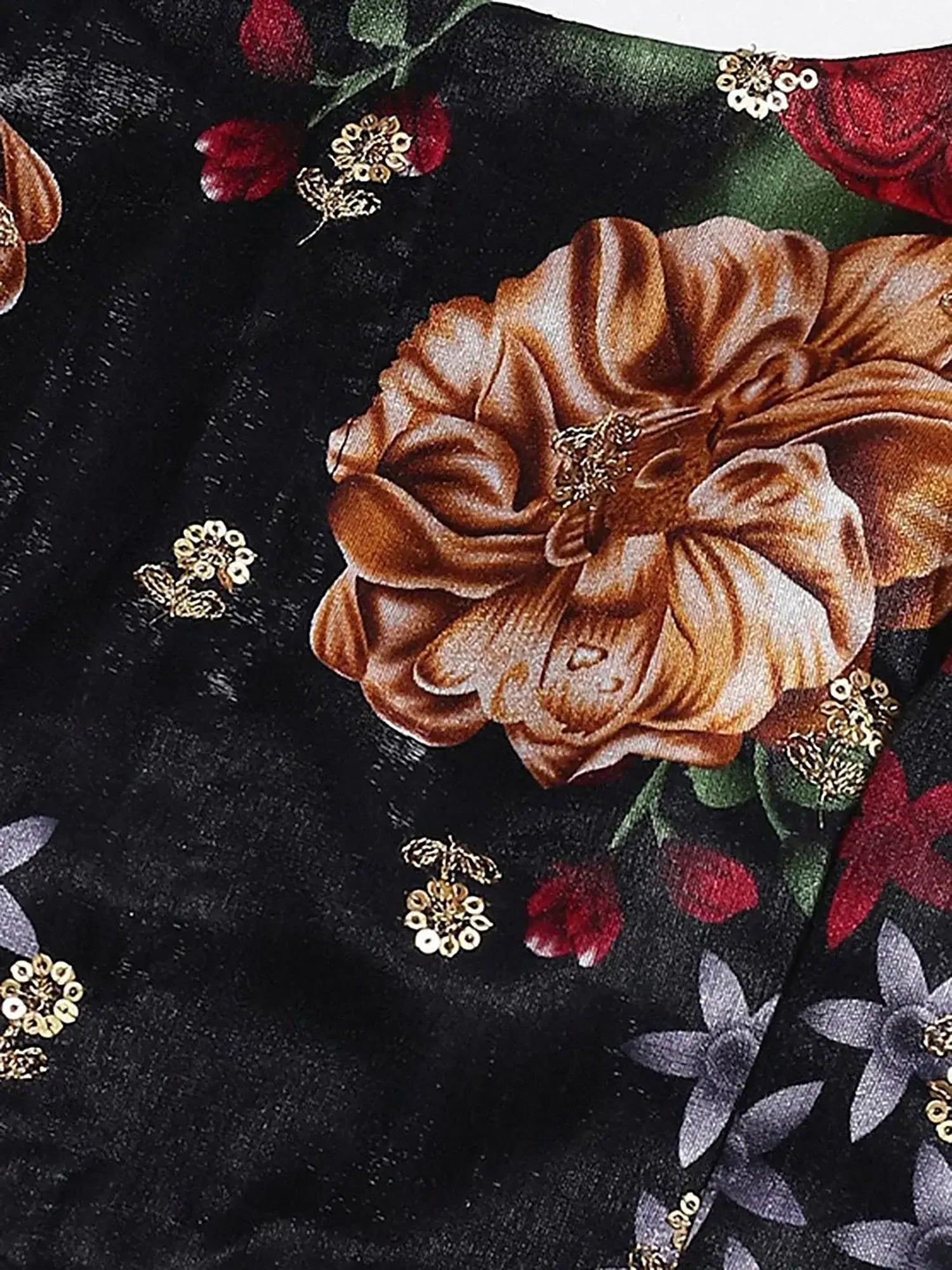 The lehenga comes in an elegant black silk fabric beautifully enhanced with vibrant, floral digital and flower prints that create a rich, festive appeal. Grand sequins and intricate border work at the hemline add shimmer and structure, giving the lehenga a luxurious and graceful finish.