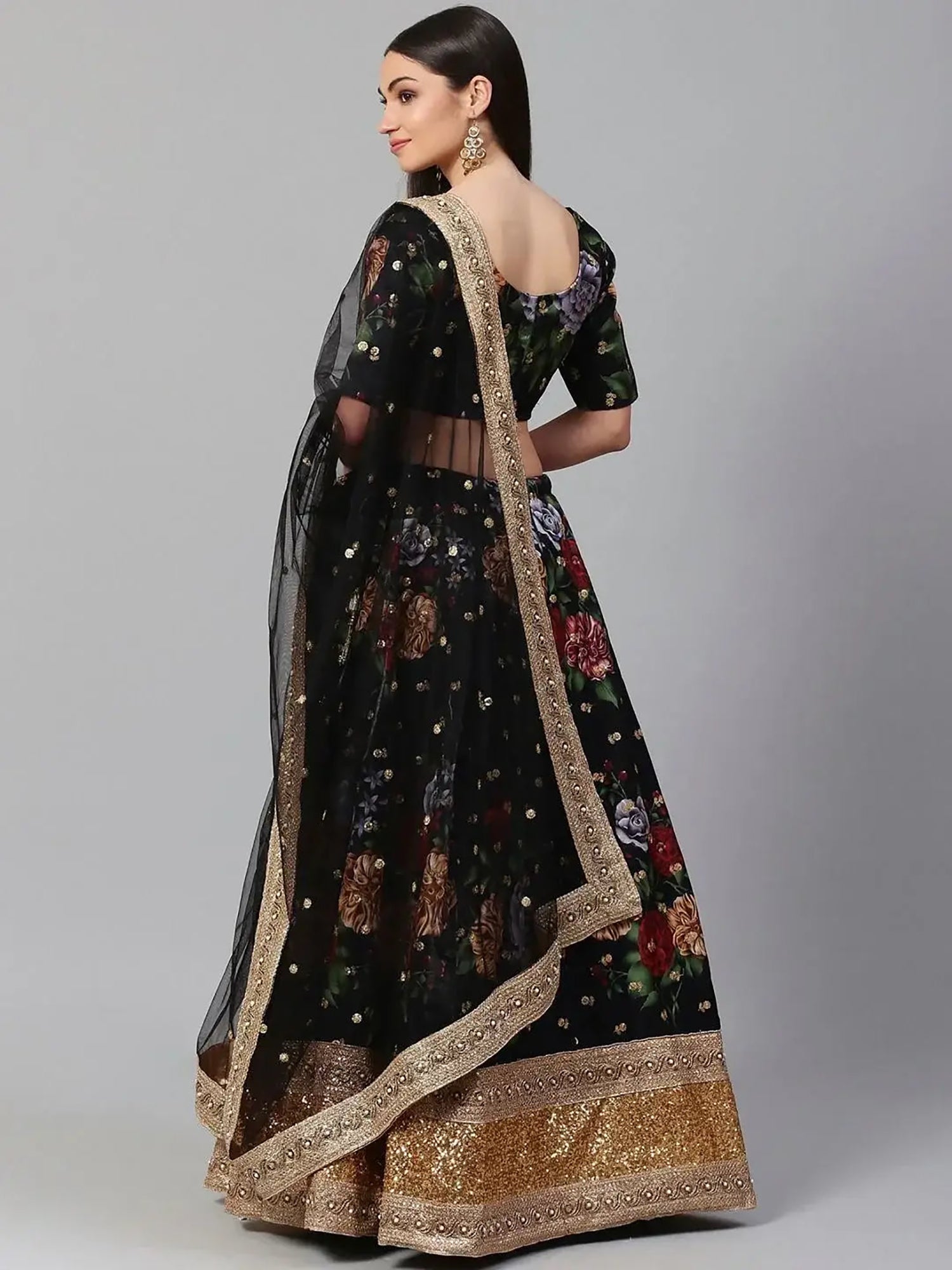 The matching black silk blouse features coordinated floral digital prints that perfectly complement the lehenga, creating a balanced and stylish ensemble. A soft net dupatta with delicate sequins detailing and elegant border work completes the look, adding sheer grace and festive charm.