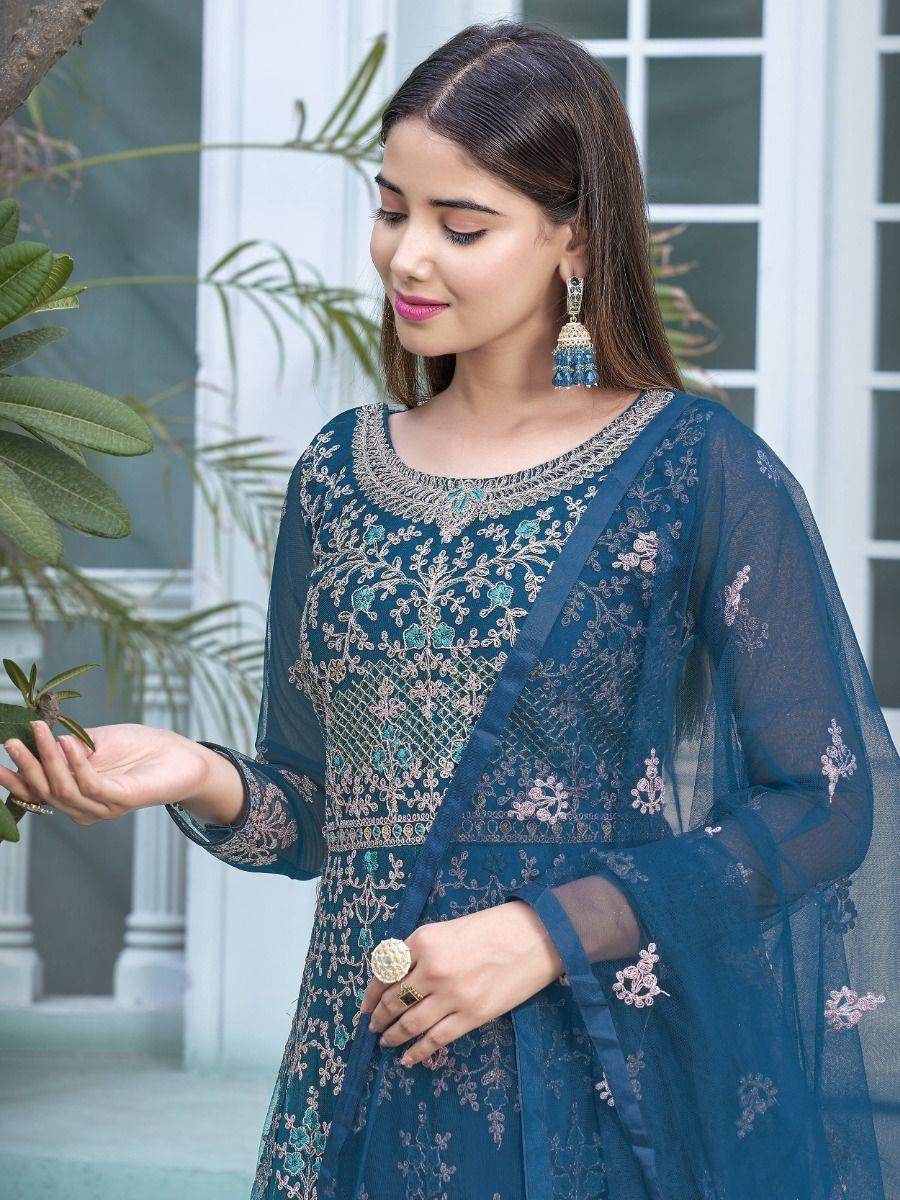 Take your fashion frolic to the next level with the impressive Blue Heavy Embroidery Net Wedding Wear Gown from Ethnic Plus. This captivating gown is made with heavy butterfly net material, adorned with dori work, sequins work, and thread embroidery. The stunning blue color is sure to make you stand out at any event or occasion.