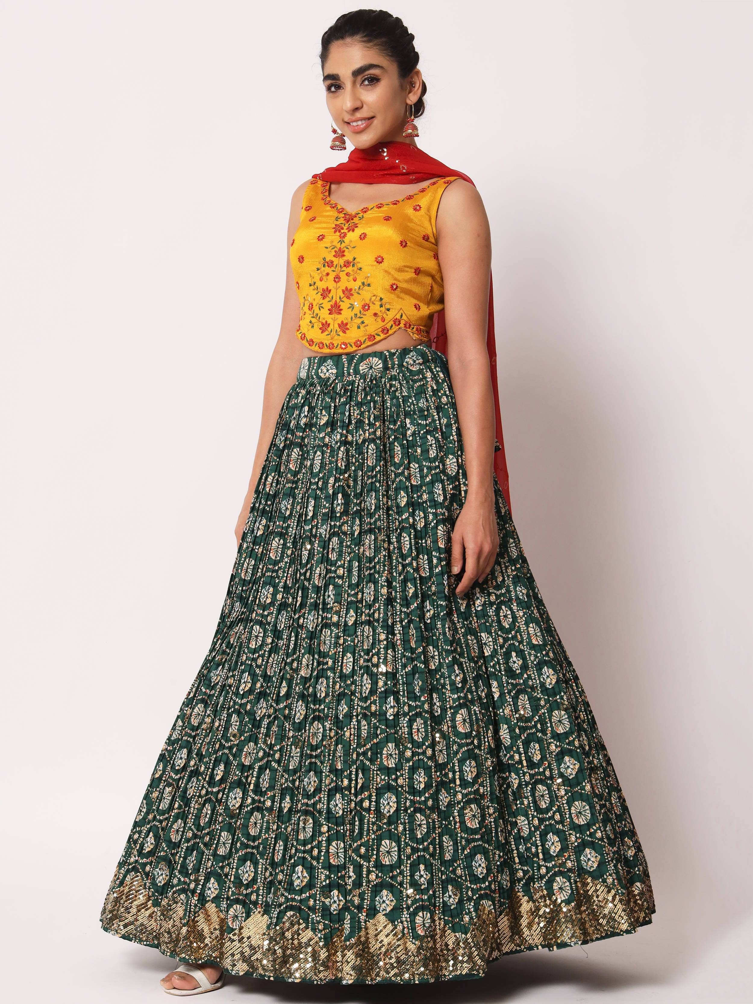 This green shibori printed lehenga is semi-stitched and can be customized up to 42 inches. The yellow choli will be fully unstitched with 0.80 mtr material and a 2.30mtr red dupatta.