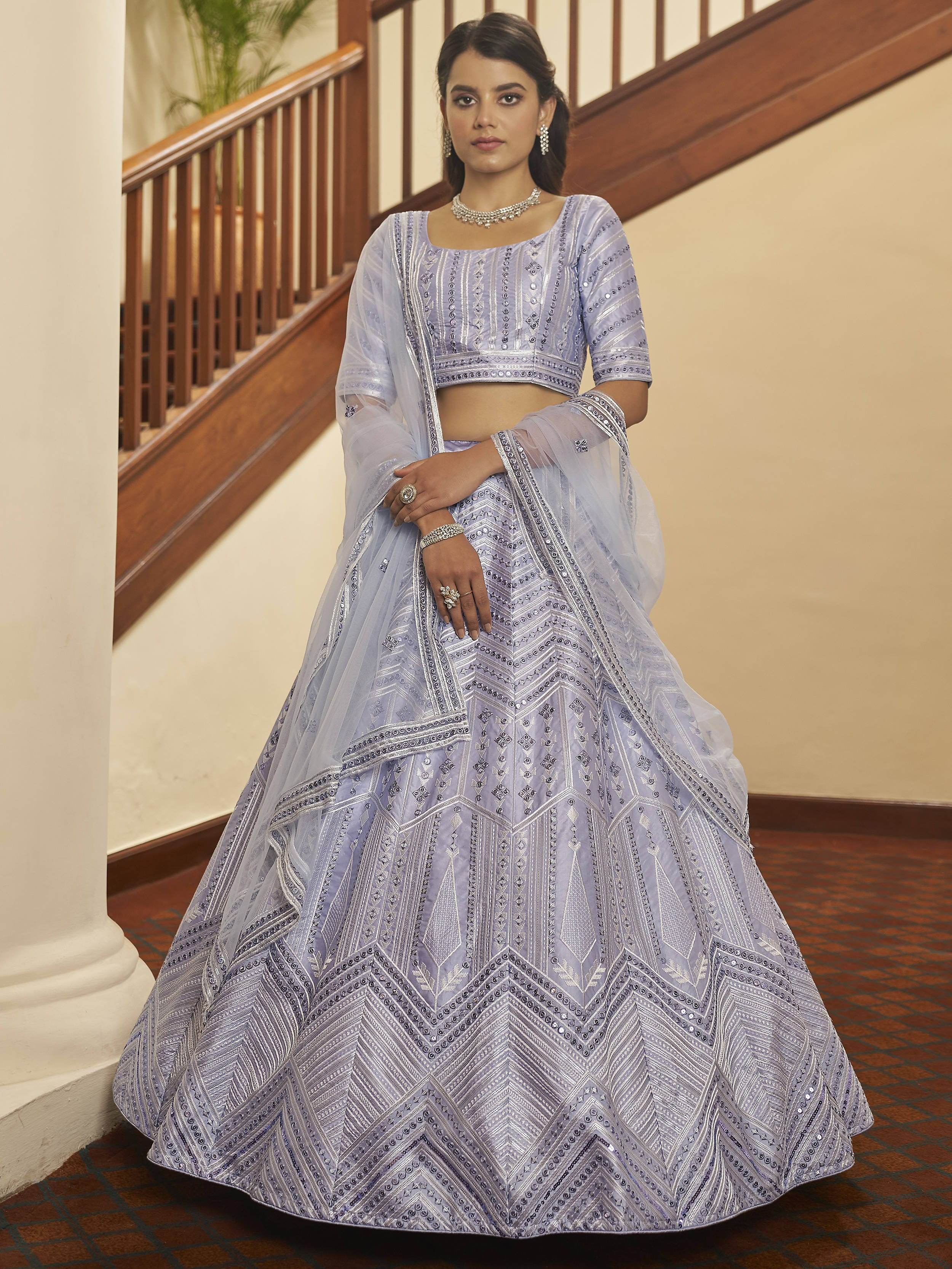 This lehenga comes with a similar color choli in silk material and lavender color similar dupatta in net material designed by sequins and thread embroidery work on the lace border.