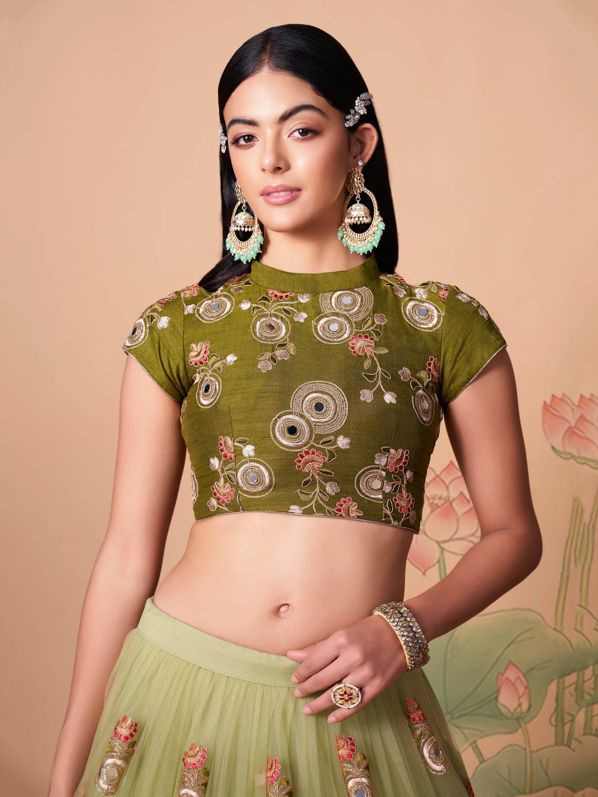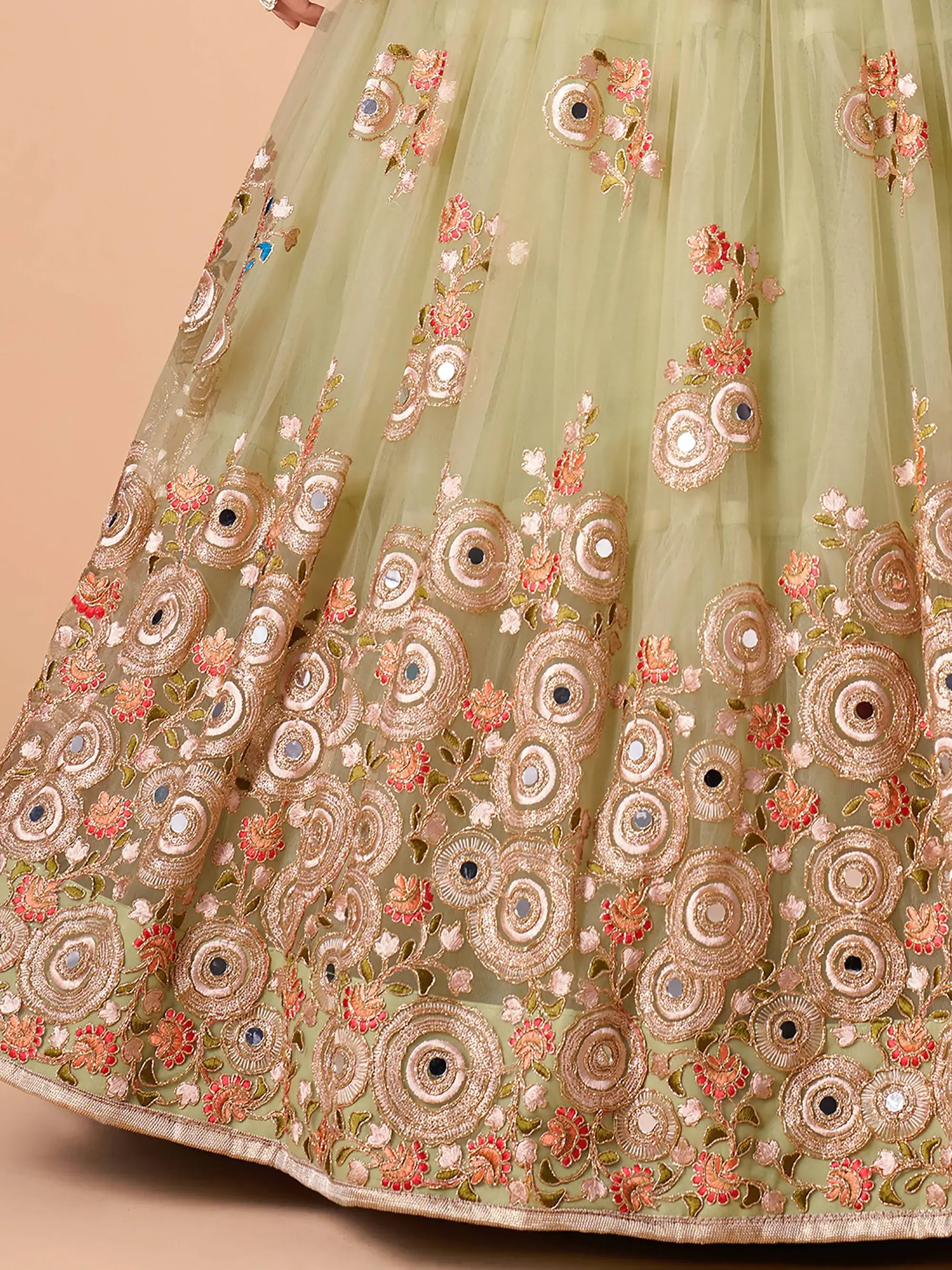 This pista green mirror-embroidered lehenga is semi-stitched and can be customized up to 42 inches. The choli will be fully unstitched material with a soft net dupatta.