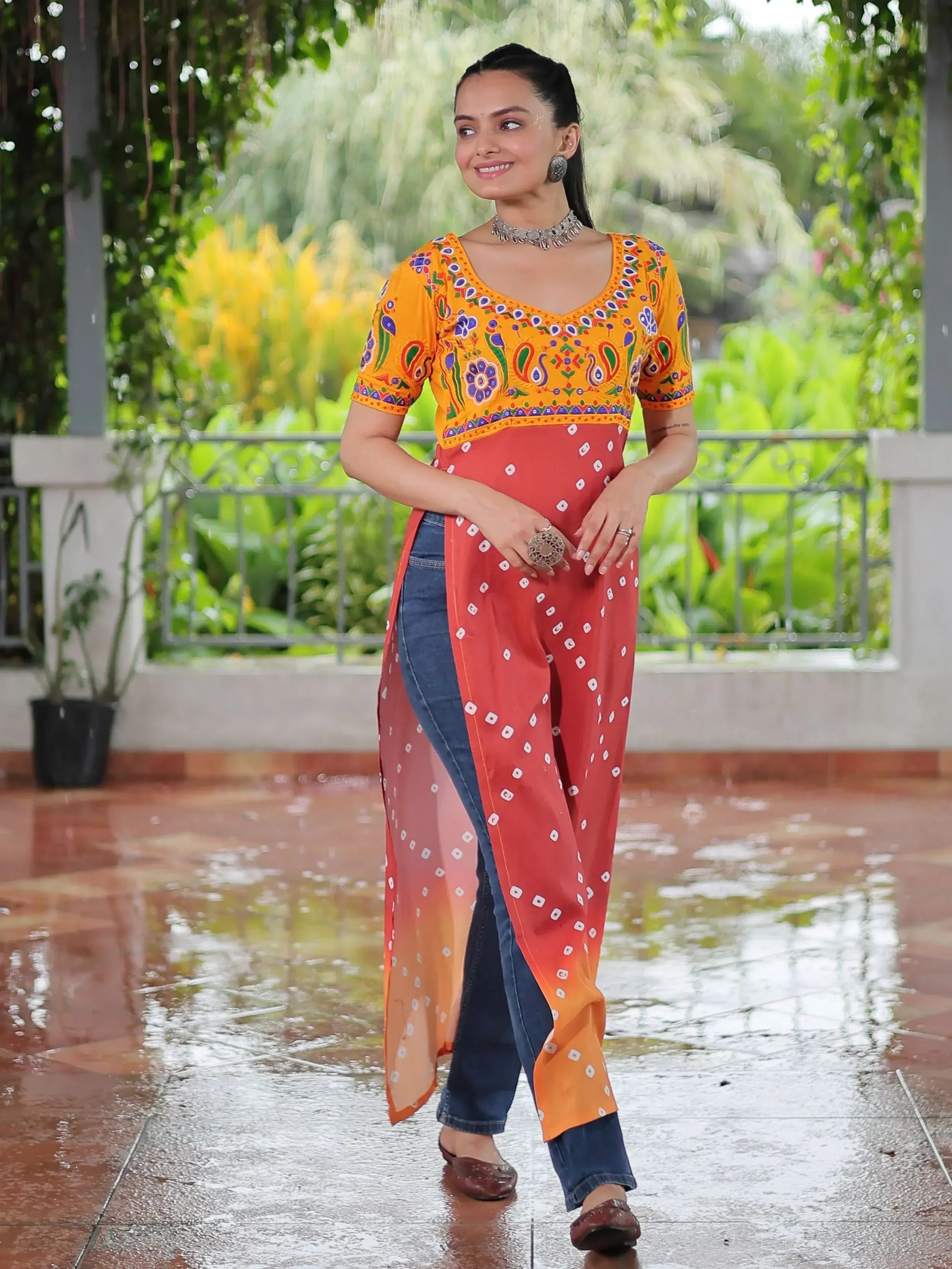 This vibrant yellow kurti is crafted from soft rayon fabric, adorned with a striking leheriya bandhani print in warm tones. The unique combination of traditional prints brings a lively ethnic charm.