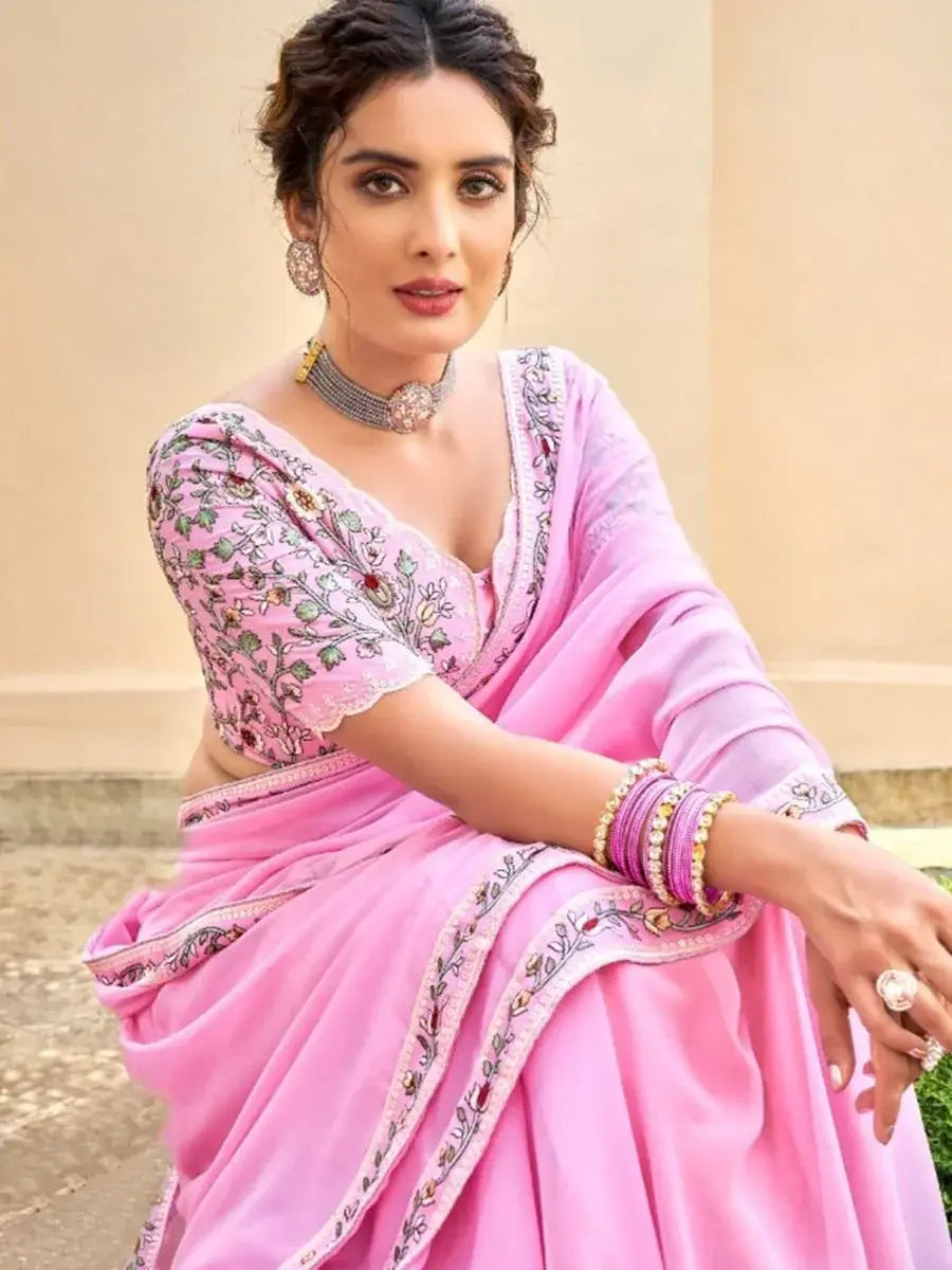 Throw your life into the classy look by wearing this magnific baby pink color saree made with georgette material and completed with a fancy embroidery lace border.