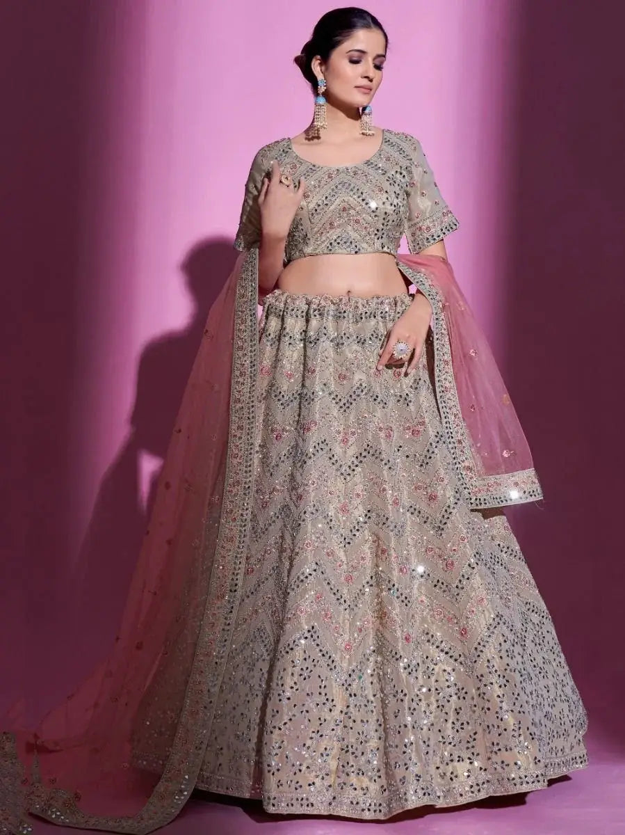 This beige color lehenga is made of gota silk material embellished with thread embroidery, dori work, sequins work and mirror work all over the feature.
