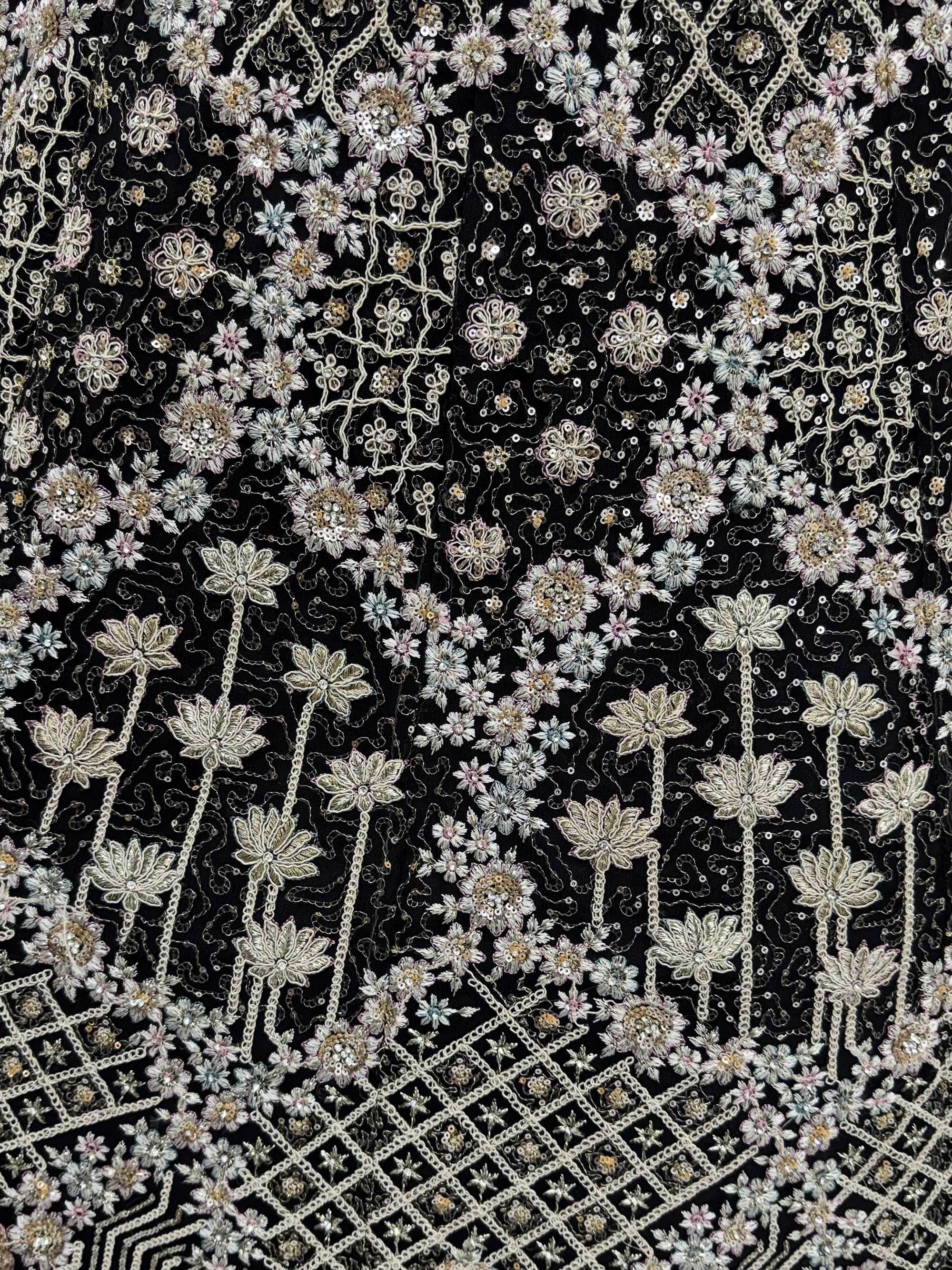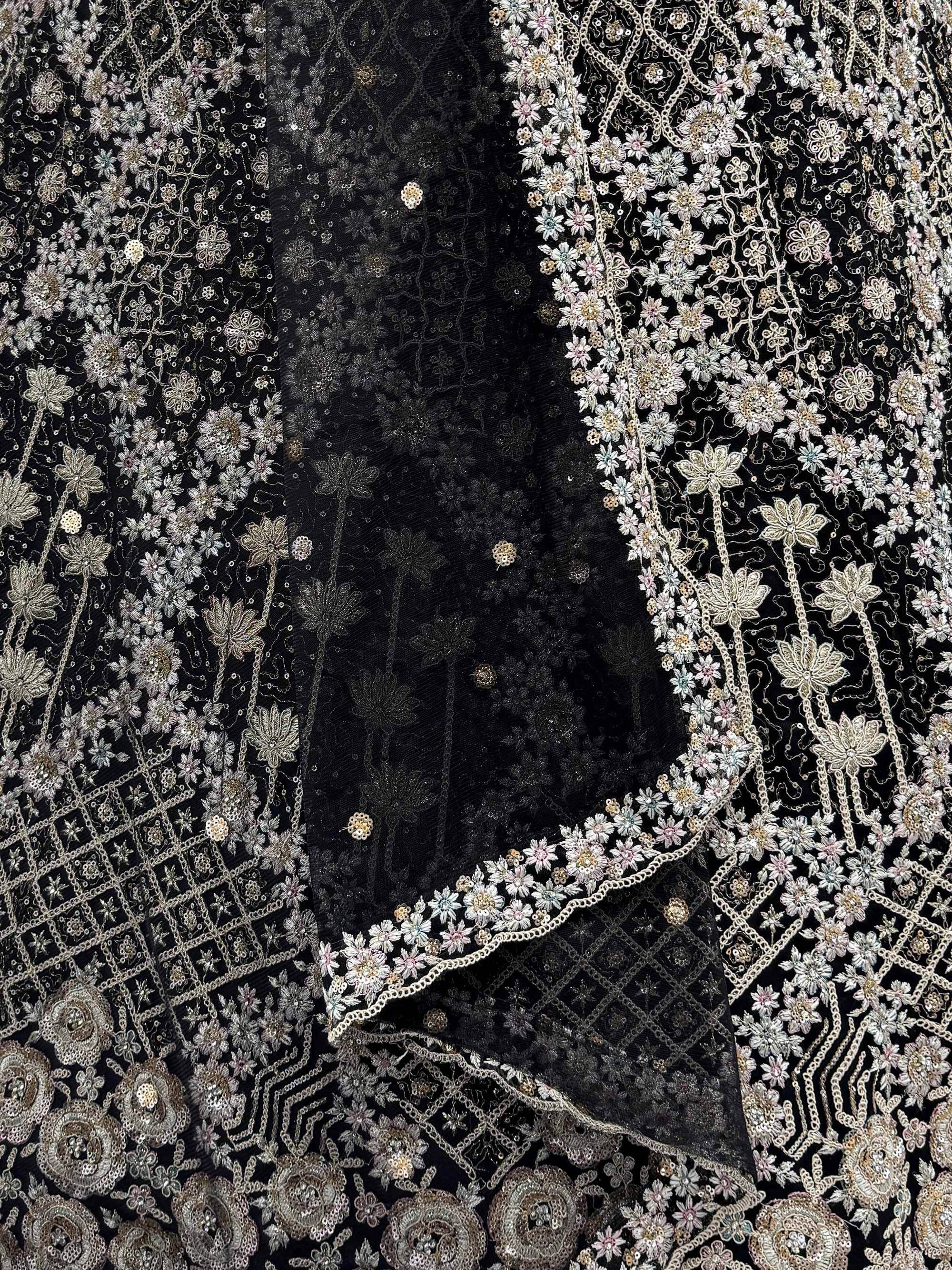 This luxurious black lehenga showcases heavy embroidery, sequins, and dori work that adds a regal charm. Its grand flair and intricate patterns make it perfect for lavish wedding functions and receptions.
