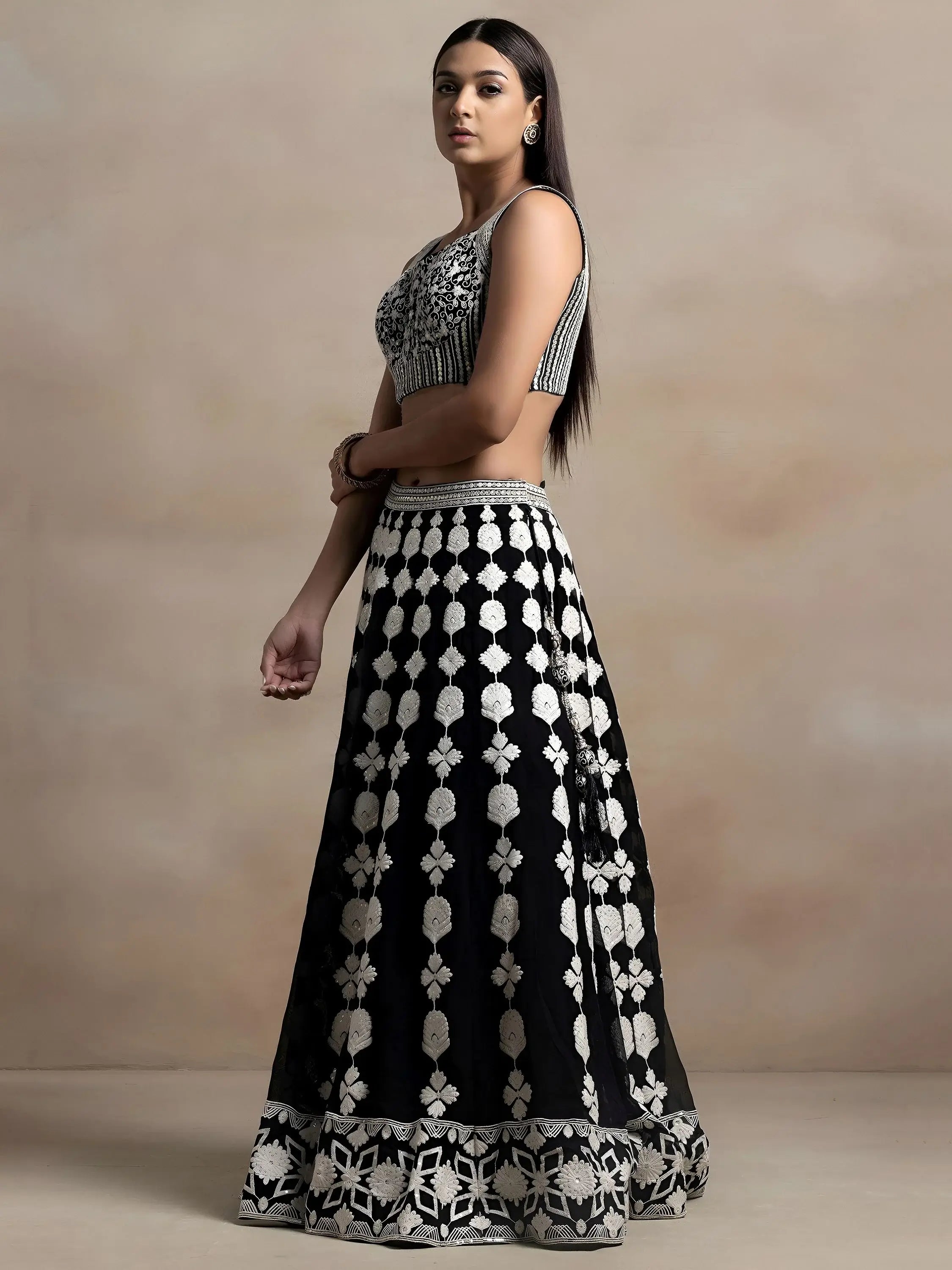 The accompanying georgette choli, featuring matching sequin and thread embroidery, enhances the overall allure, making it an ideal choice for grand occasions. Whether you're attending a wedding or a festive celebration, this mesmerizing black lehenga choli promises to make you stand out.