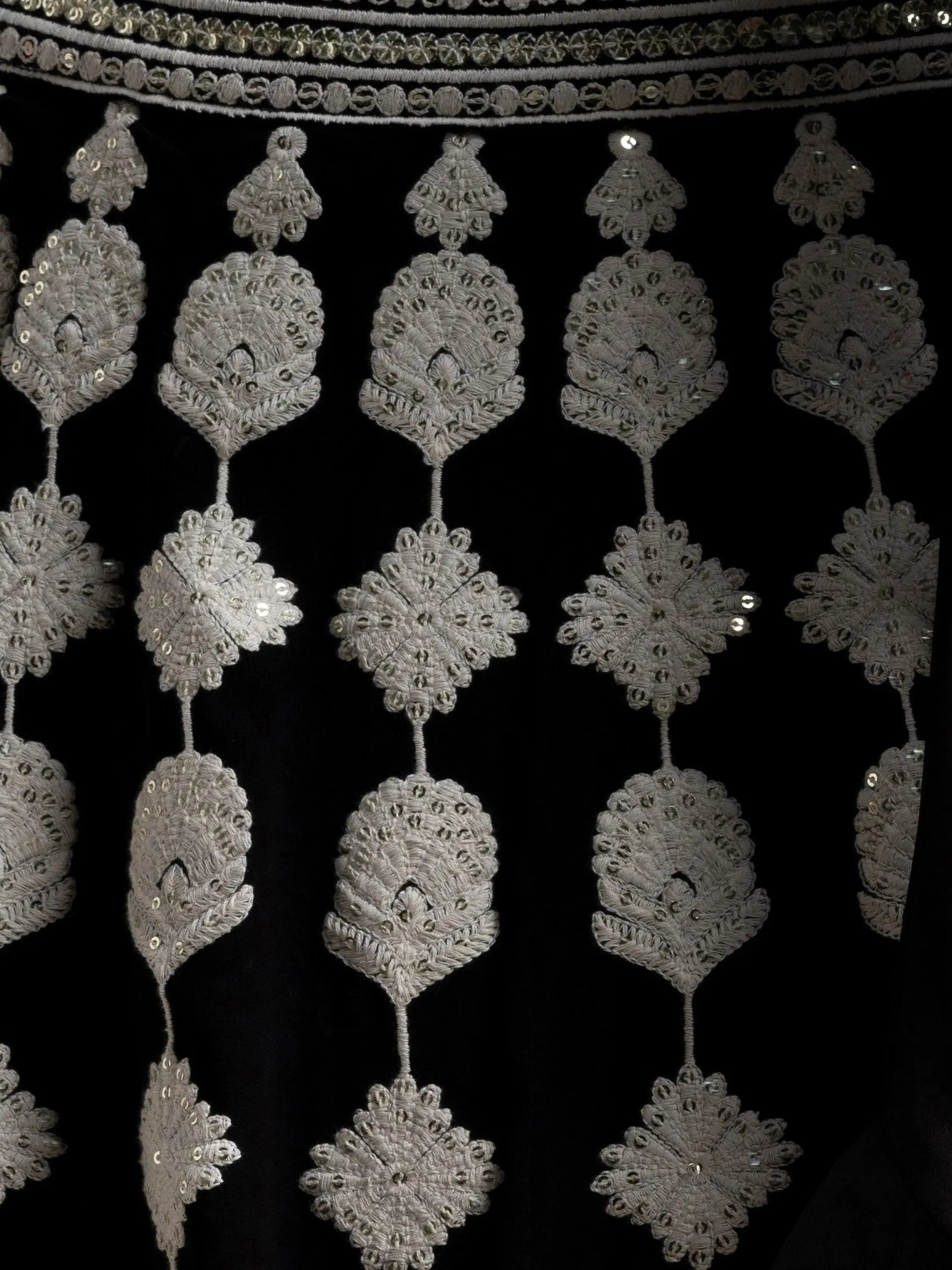 Adding a touch of sophistication, the ensemble is completed with a stunning black georgette dupatta, beautifully embellished with sequin work, delicate thread embroidery, and an attractive four-side lace border. With a length of 2.40 meters, this drape gracefully complements the lehenga, enhancing its beauty.