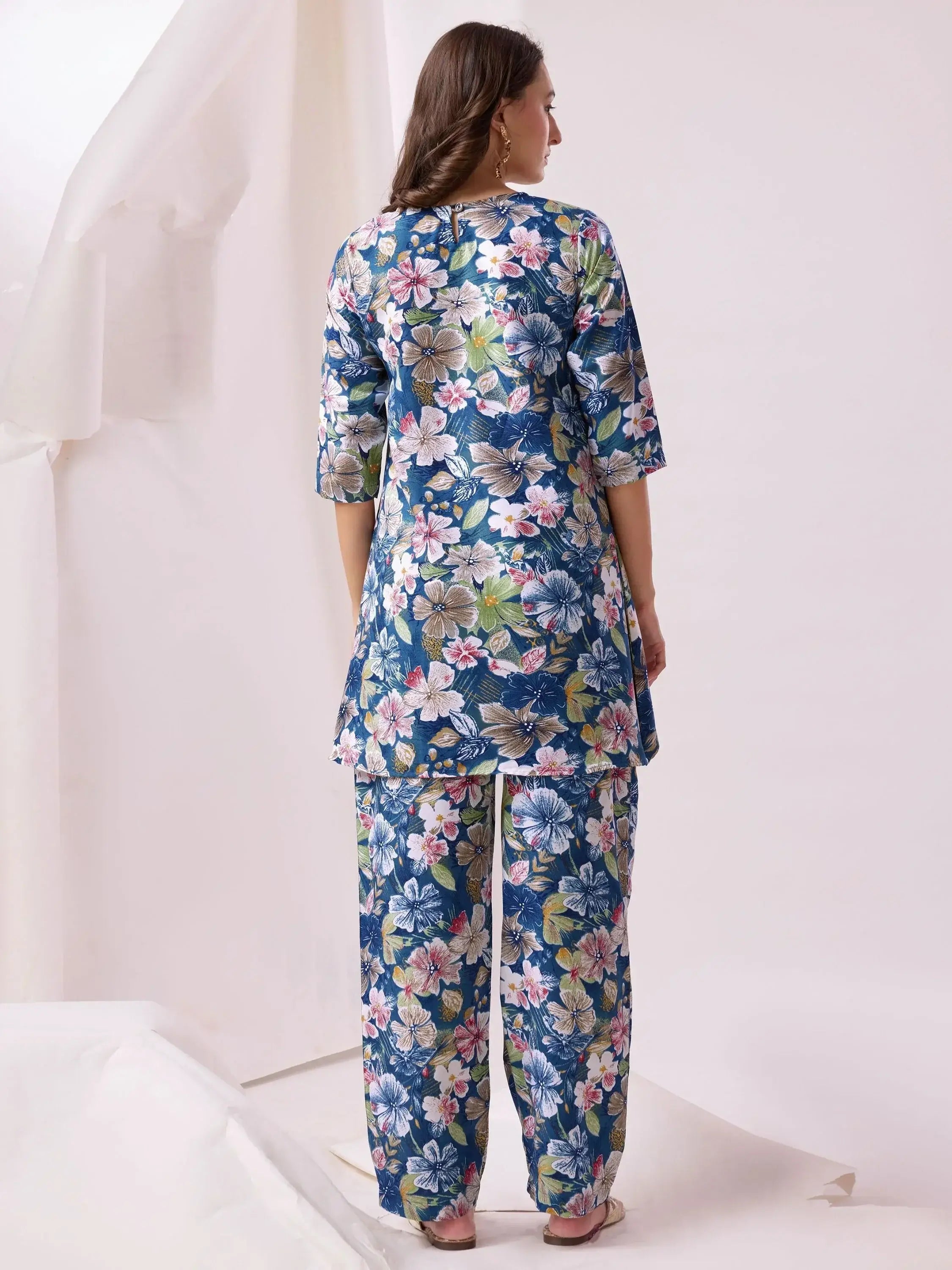 This blue top and palazzo co-ord set is not just about aesthetics; it is also about versatility. Its timeless design and classic color make it suitable for various occasions. Pair it with statement jewelry or subtle accessories to create a unique and personalized look. The floral prints lend a festive vibe, while the overall design maintains an air of understated elegance, perfect for both casual and formal events.