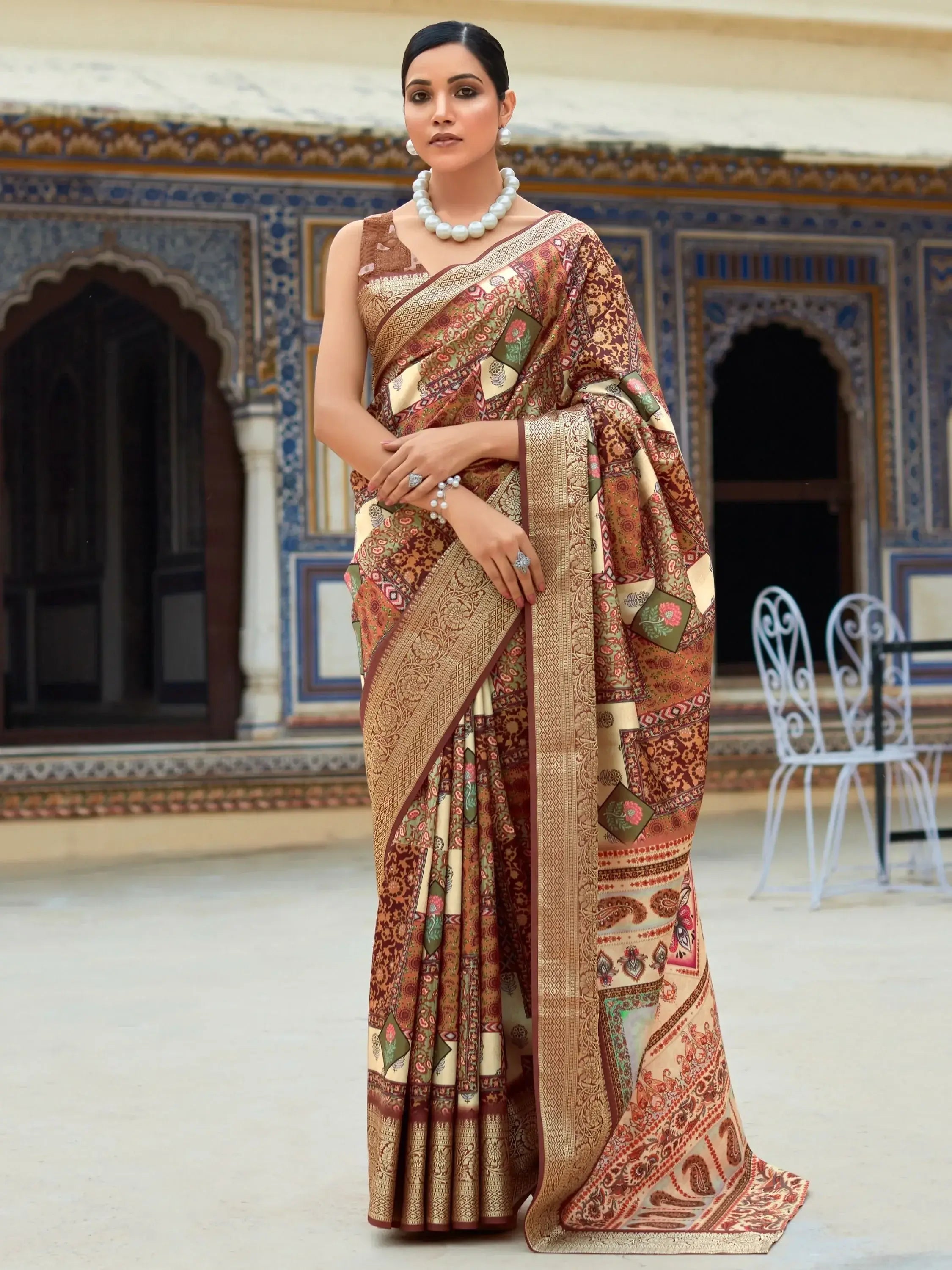 Elevate your ethnic wear collection with our incredible brown digital printed silk events wear saree with blouse. This stunning saree comes in hues of brown, made from luxurious silk material with digital print work and intricate zari weaving. The printed work elevates its charm, making it the perfect pick for any special occasion or festival.