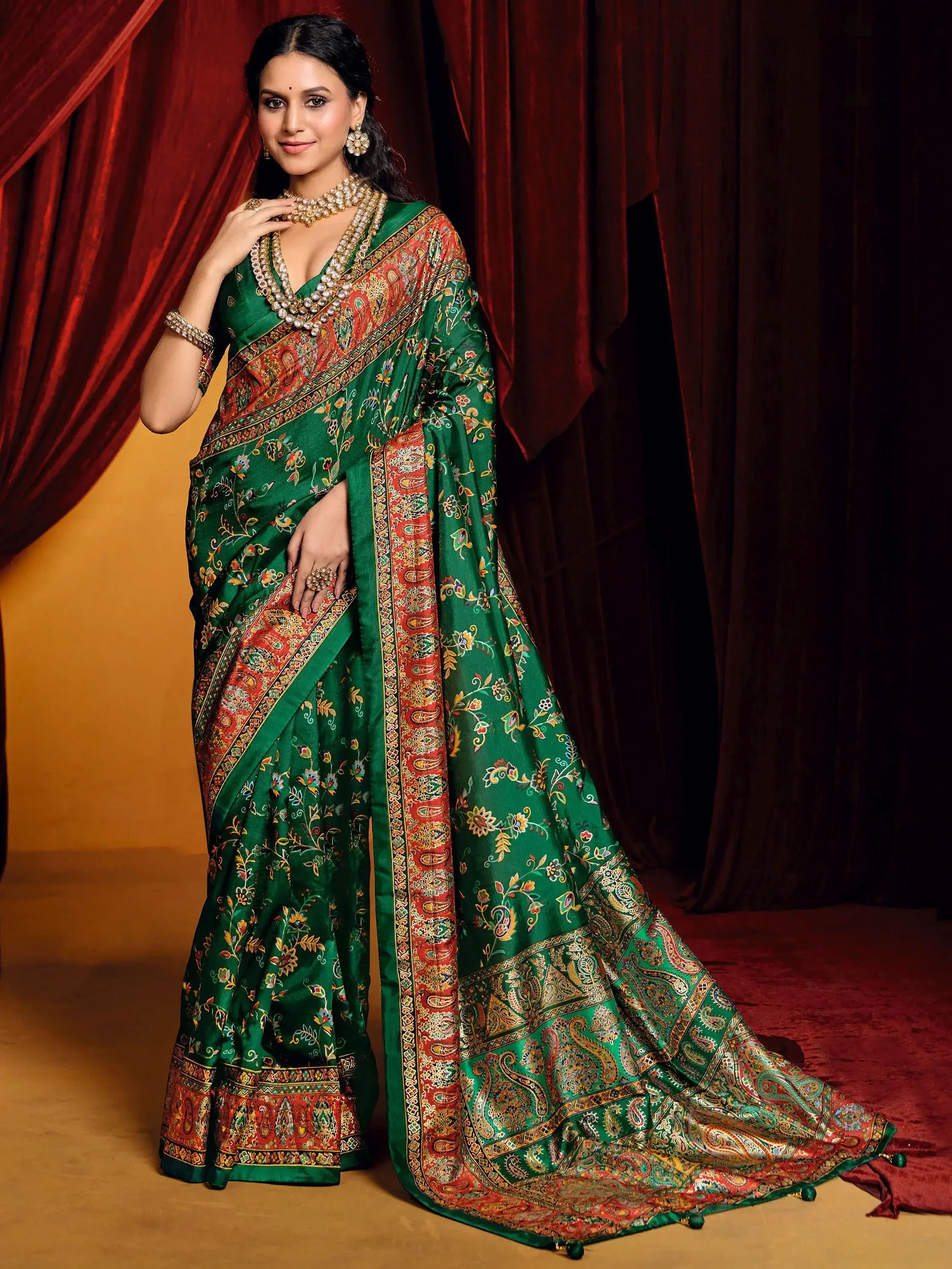 This dark green color Tussar silk saree features intricate paisley printed work. The richness of dark green lends a regal and sophisticated aura, while the soft, textured Tussar silk adds a graceful drape that is both flattering and comfortable. The traditional paisley motifs scattered across the fabric enhance its heritage appeal, making it a perfect blend of elegance and culture.