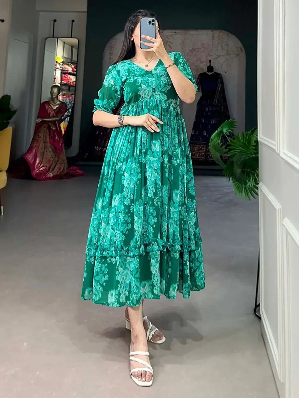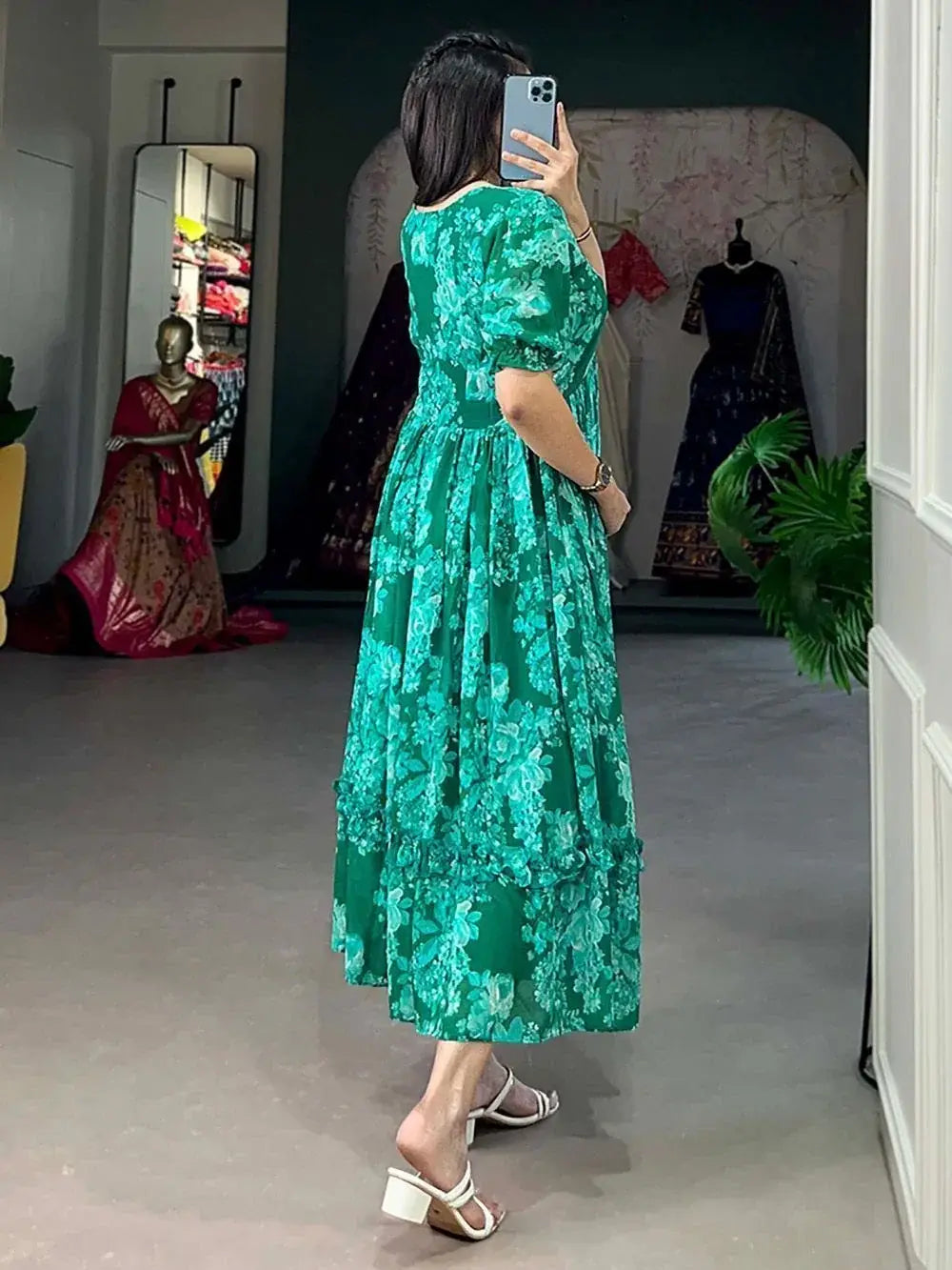 Our green floral printed georgette festival wear dresses are a must-have for any fashion-forward individual looking to make a statement at their next event. Whether paired with bold accessories or worn on their own, these dresses are sure to turn heads and leave a lasting impression.