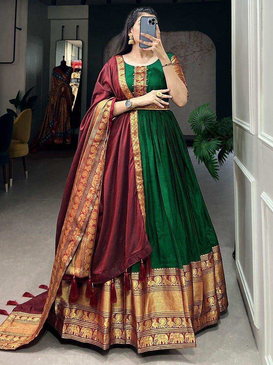 Wearing this green gown will instantly transform your look, whether it's for a traditional festival, a special event, or any other function. Pair it with matching accessories and heels to complete your perfect ensemble. The versatility of this gown ensures that you will always look and feel your best, no matter the occasion.