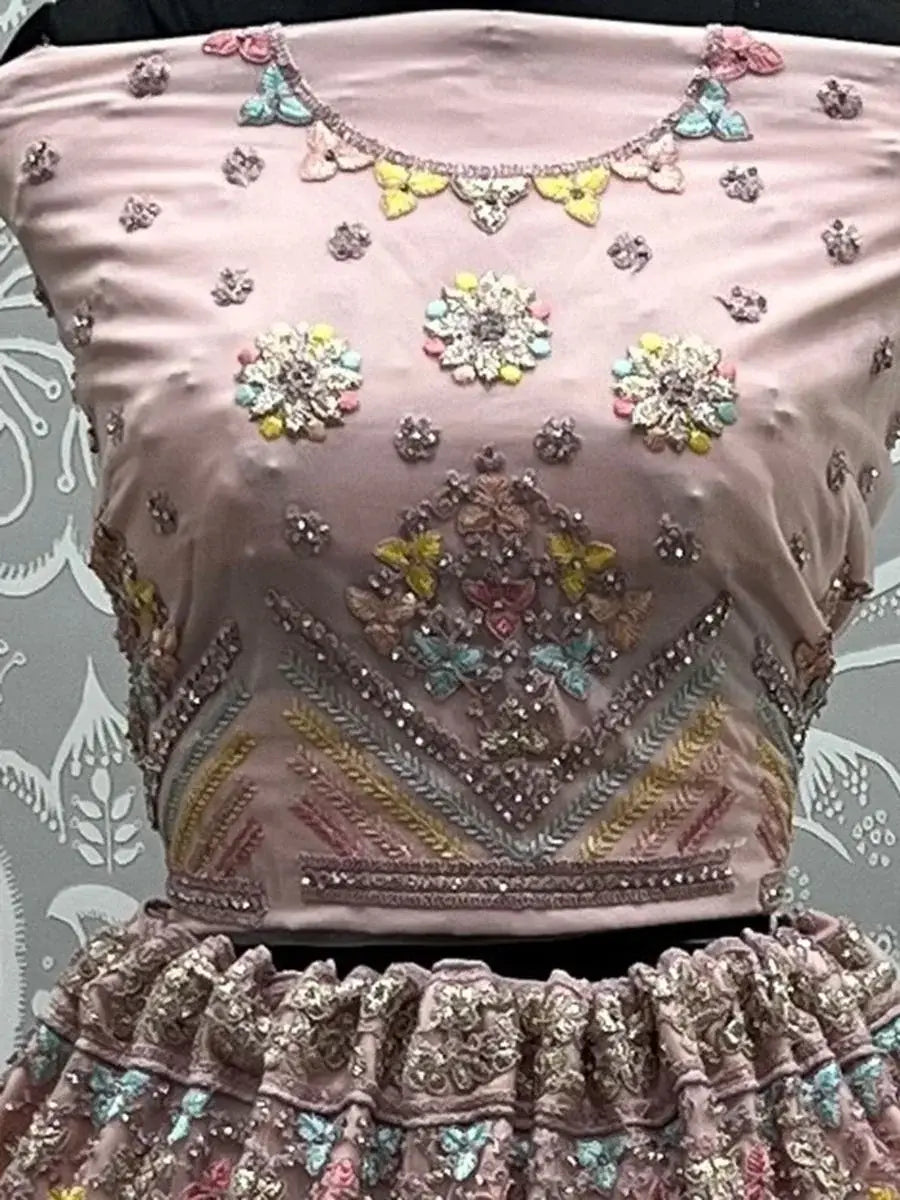This light pink lehenga choli is semi-stitched and can be customized up to 42 inches, also have a standard canvas and cancan. The choli will be unstitched material (1 meter).