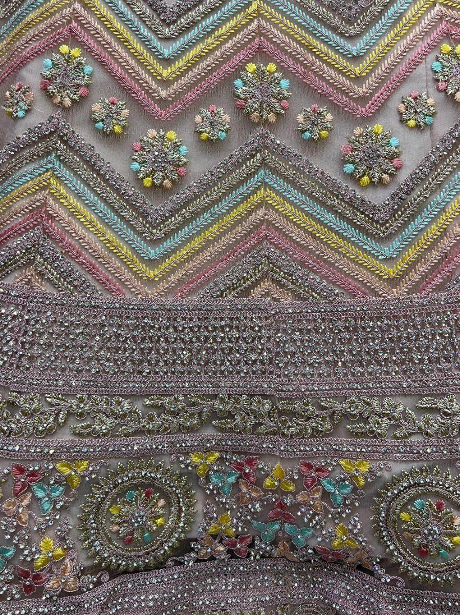 This light pink lehenga comes with a similar color choli made with bridal net material developed with thread work, stone work, and dori work. It also comes with a similar color soft net material dupatta finished with lace border, stonework, and threadwork.