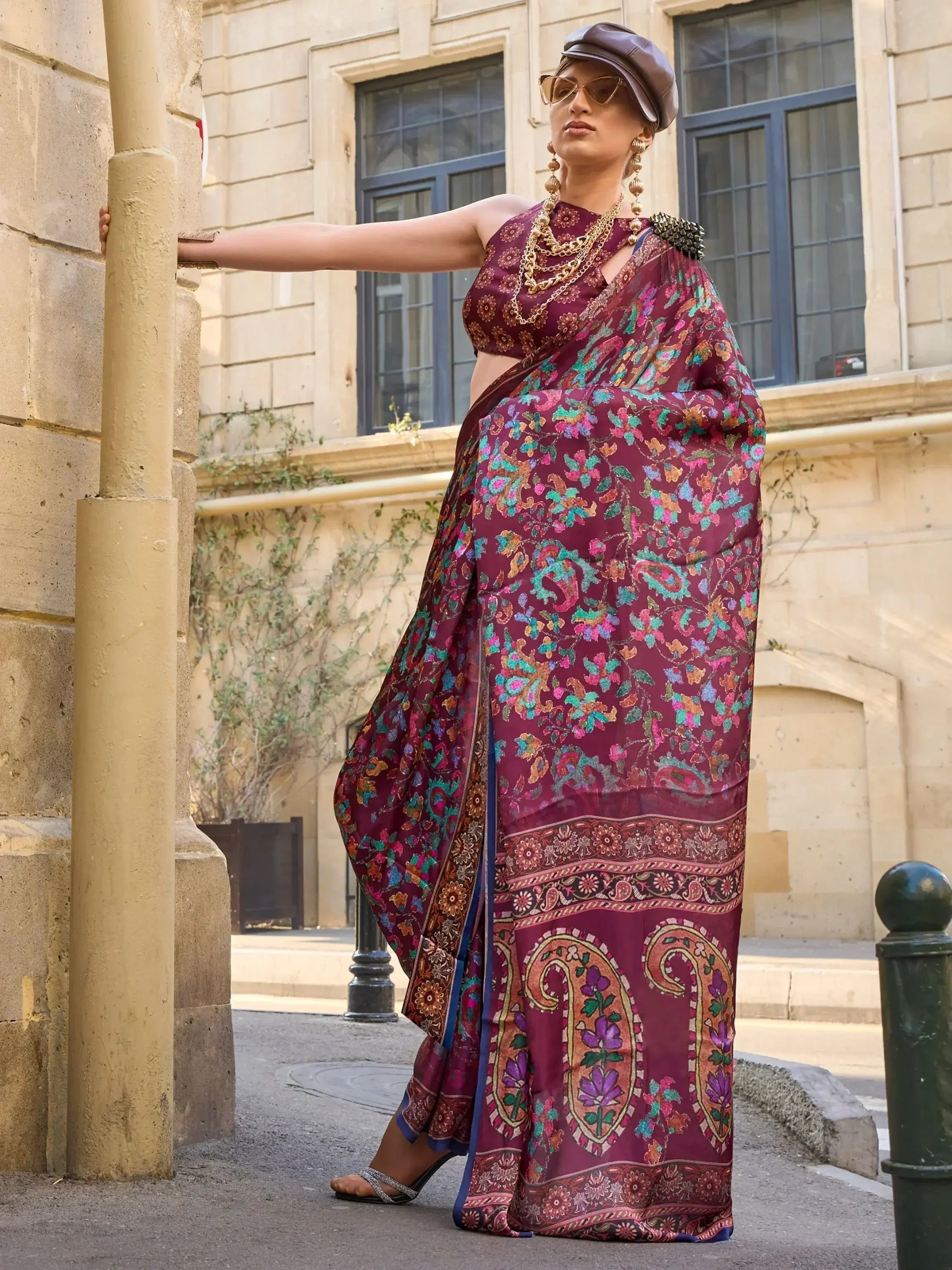 The maroon color of this saree is rich and captivating, making it a perfect choice for those who want to make a style statement without going overboard with accessories. The matching satin blouse with digital print work complements the saree perfectly, creating a cohesive and coordinated look that is sure to turn heads wherever you go.