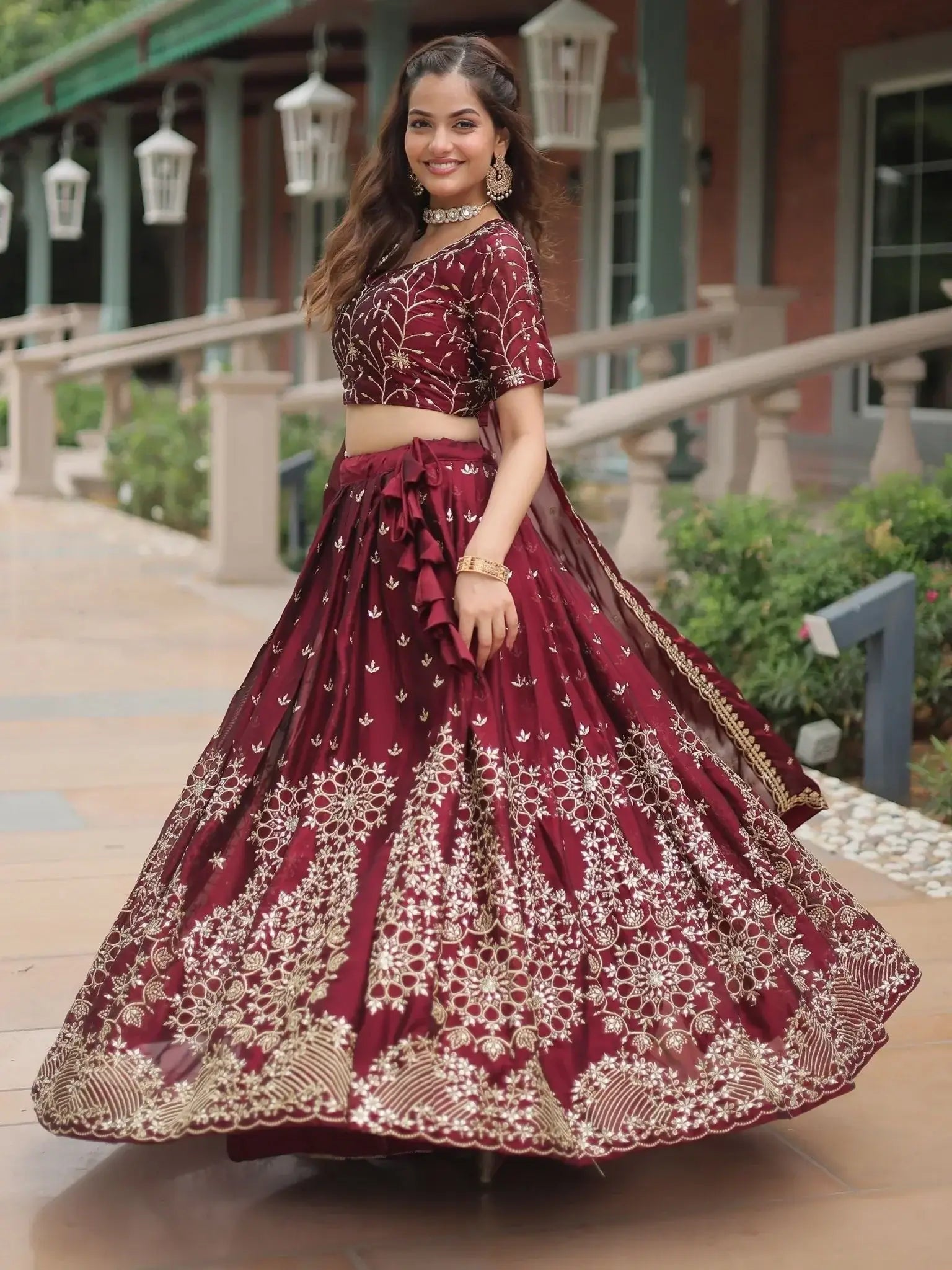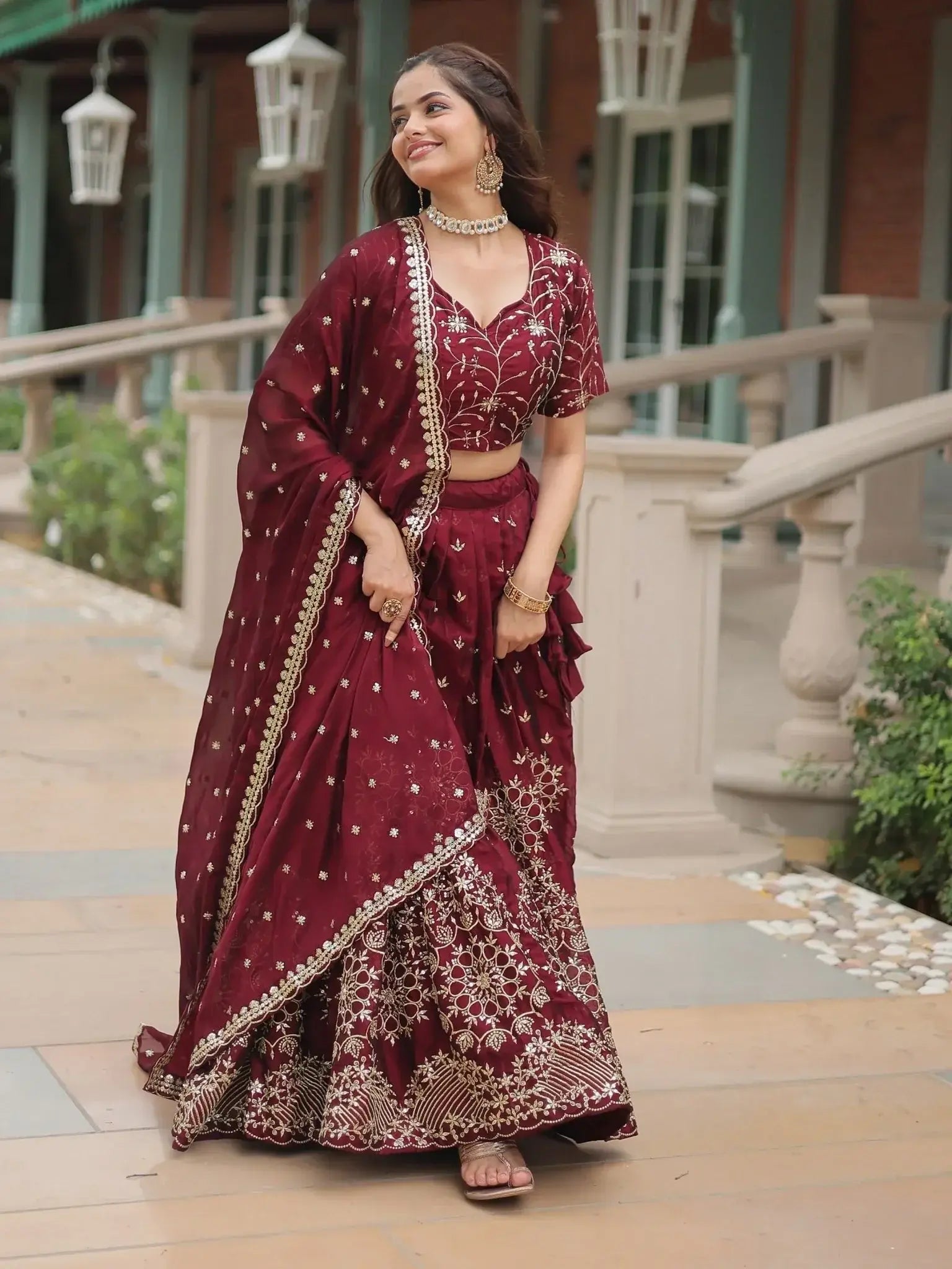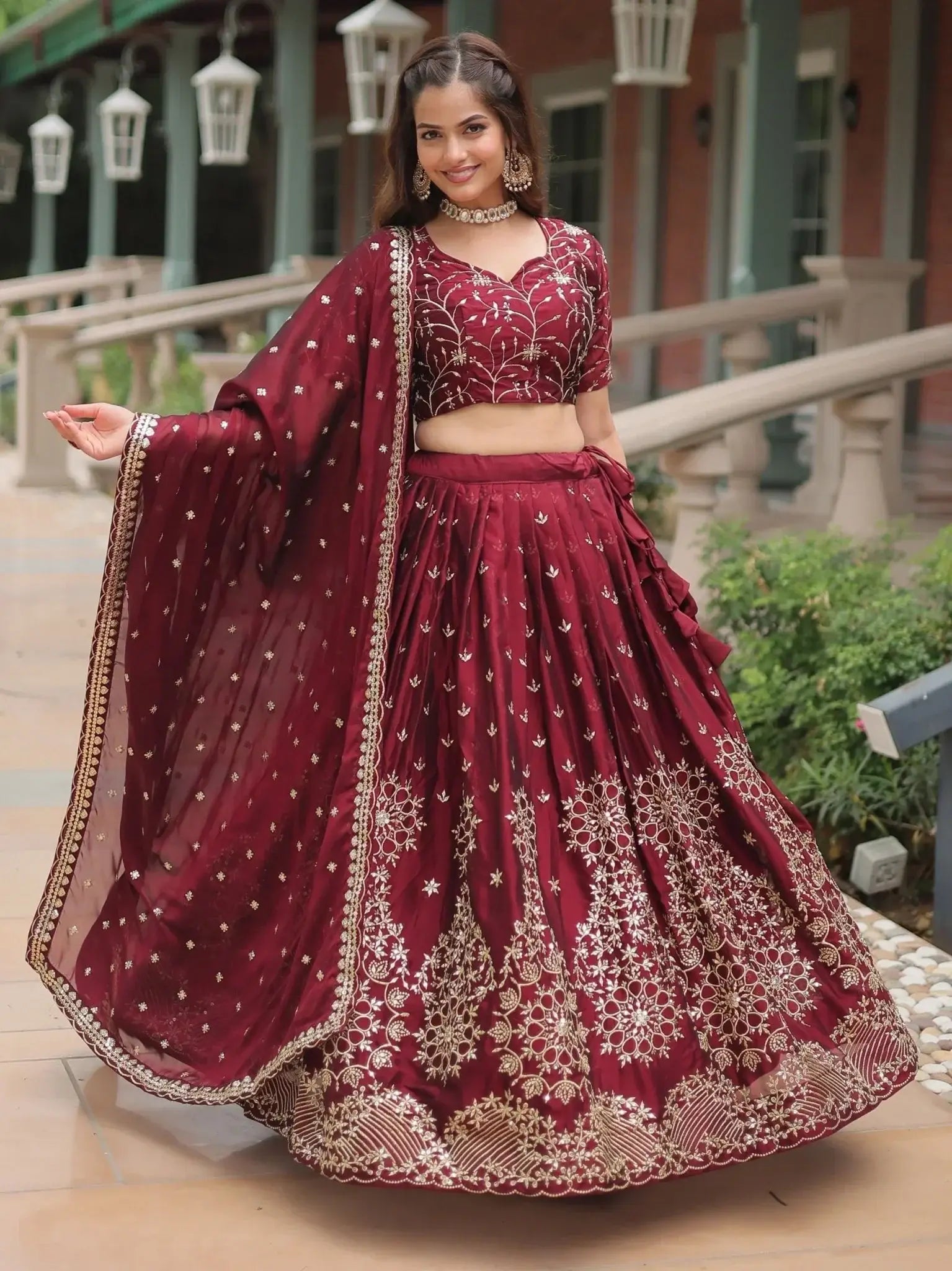 This exquisite lehenga choli set includes the rich maroon color, the luxurious silk fabric, and the detailed sequin and thread embroidery work. The matching blouse and dupatta complete the look, creating a cohesive and elegant ensemble that is sure to turn heads wherever you go.