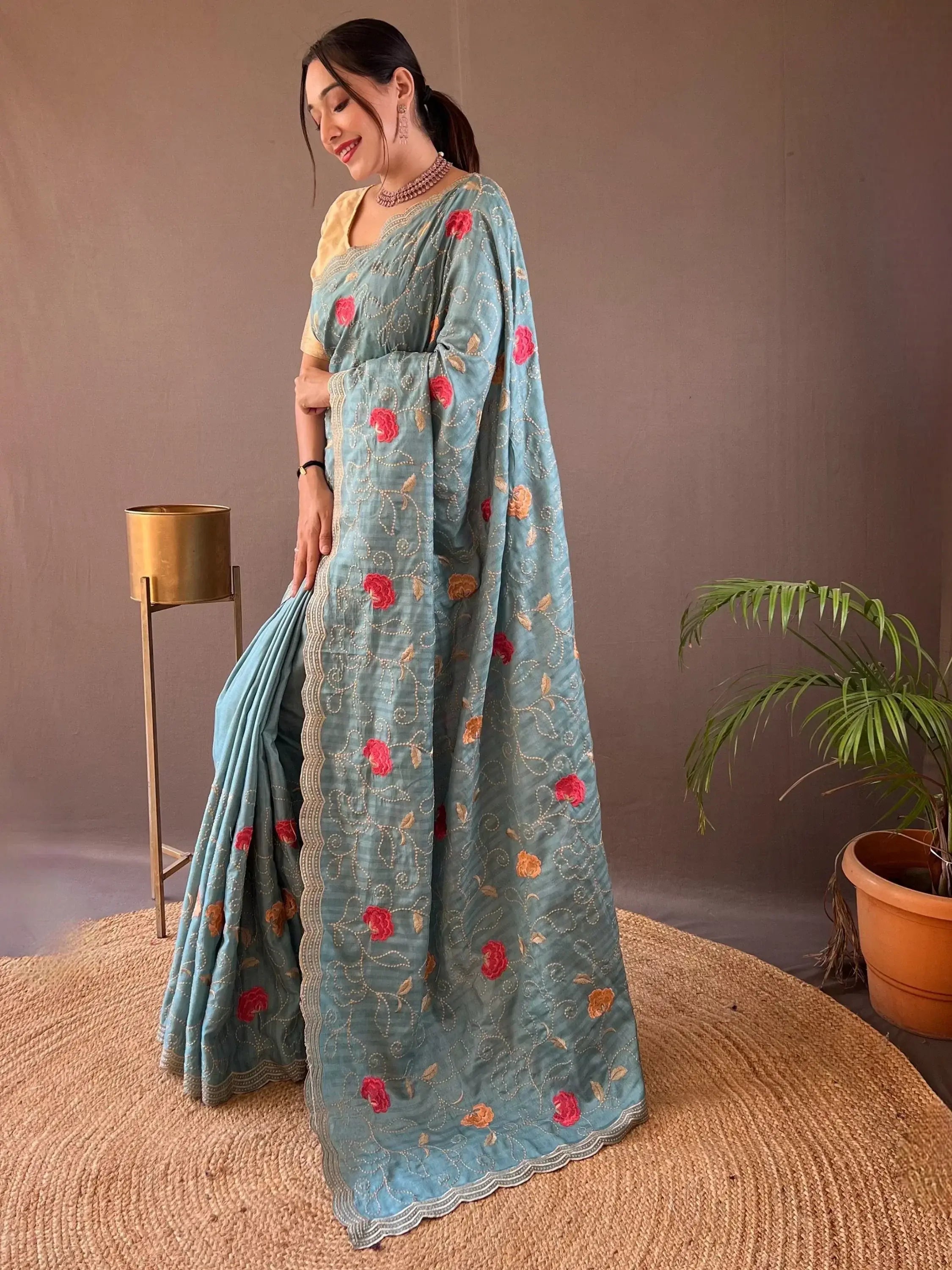 The vibrant sky-blue color of the saree evokes a sense of tranquility and serenity, while the exquisite floral embroidery and cutwork detailing on the border add a touch of intricate beauty. Each stitch is a testament to the skill and craftsmanship of the artisans, infusing the saree with a sense of artistry and charm that is truly unparalleled.