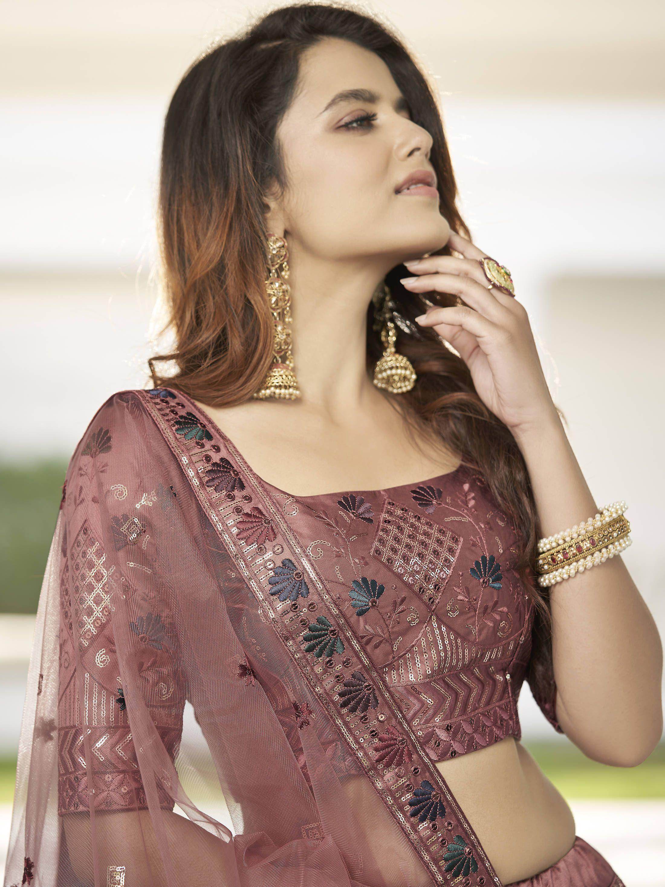This lehenga comes with a similar color choli in silk material with sequins and thread embroidery work and a similar net dupatta embellished with sequins and thread embroidered work border.