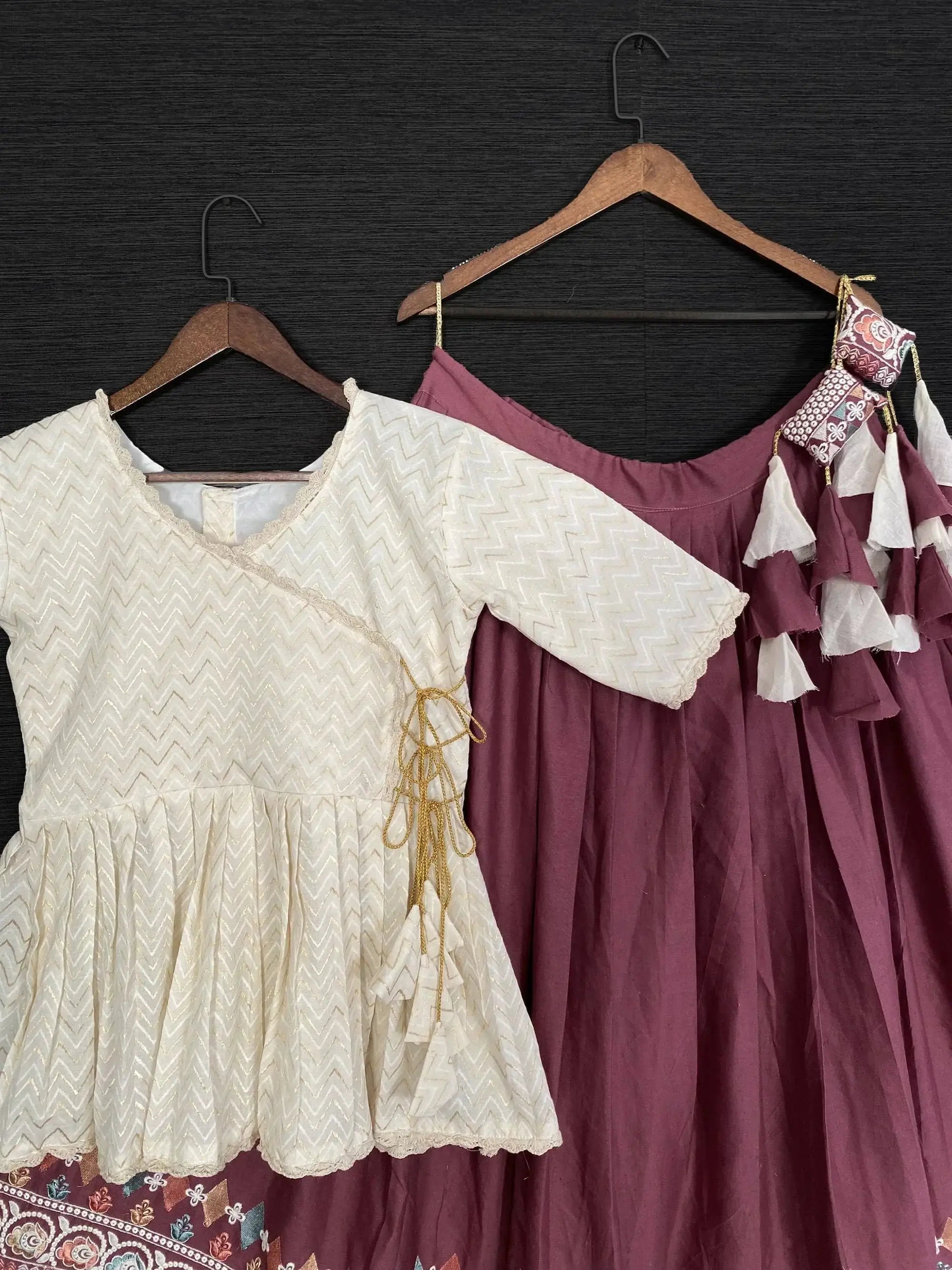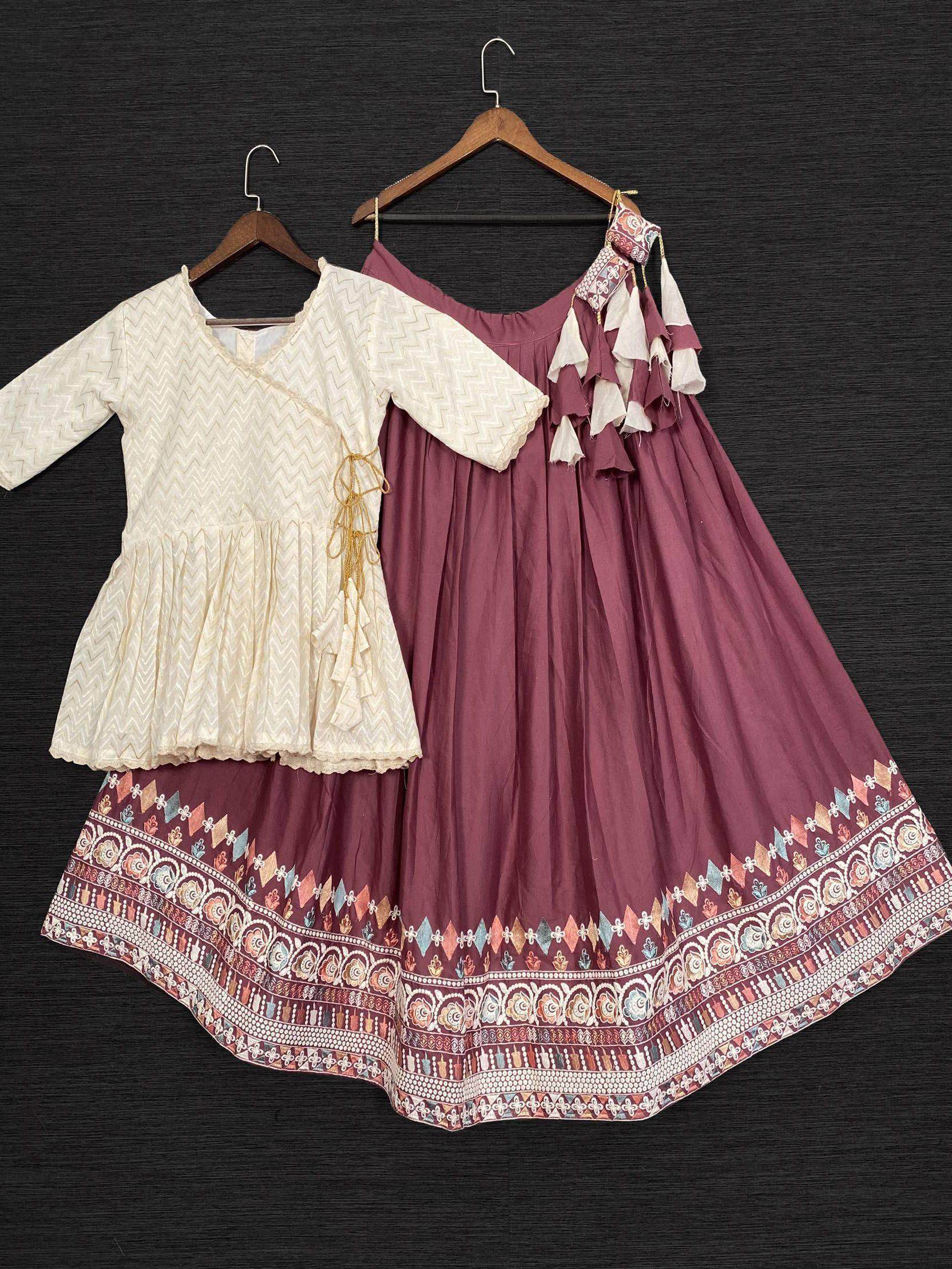 Add elegance and charm to your appearance by dressing in this gorgeous lavender lehenga made of cotton material embellished with embroidery work featured with a beautiful tassel design.