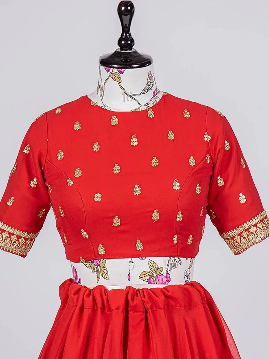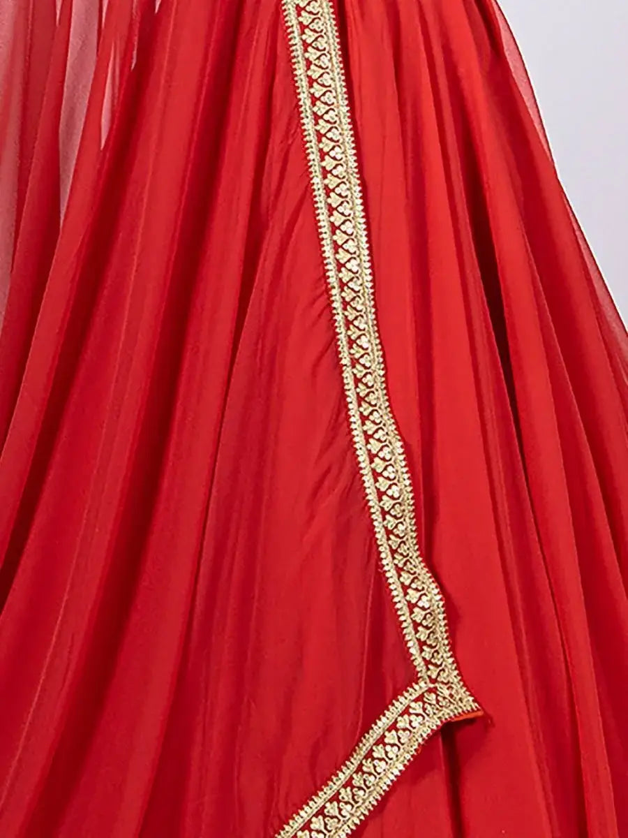 This designer red georgette lehenga is paired with sequins embroidery work blouse material in similar red color and a georgette dupatta with delicate golden embroidered lace.