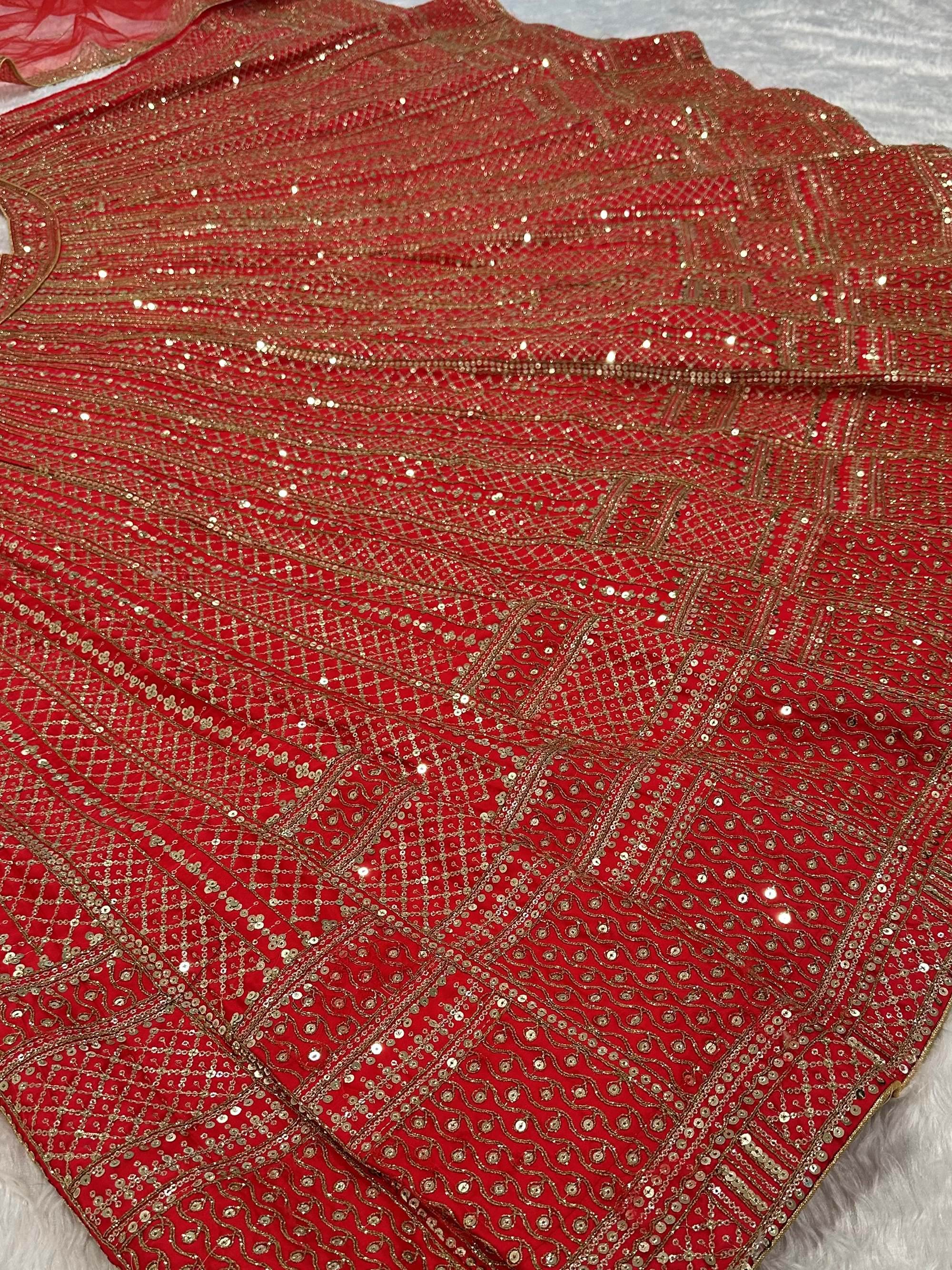This stunning red lehenga is crafted from heavy malai satin and fully adorned with sparkling sequins and intricate dori work. The rich geometric and traditional motifs create a royal bridal look with its 3.5-meter grand flair and can-can attached for perfect volume.