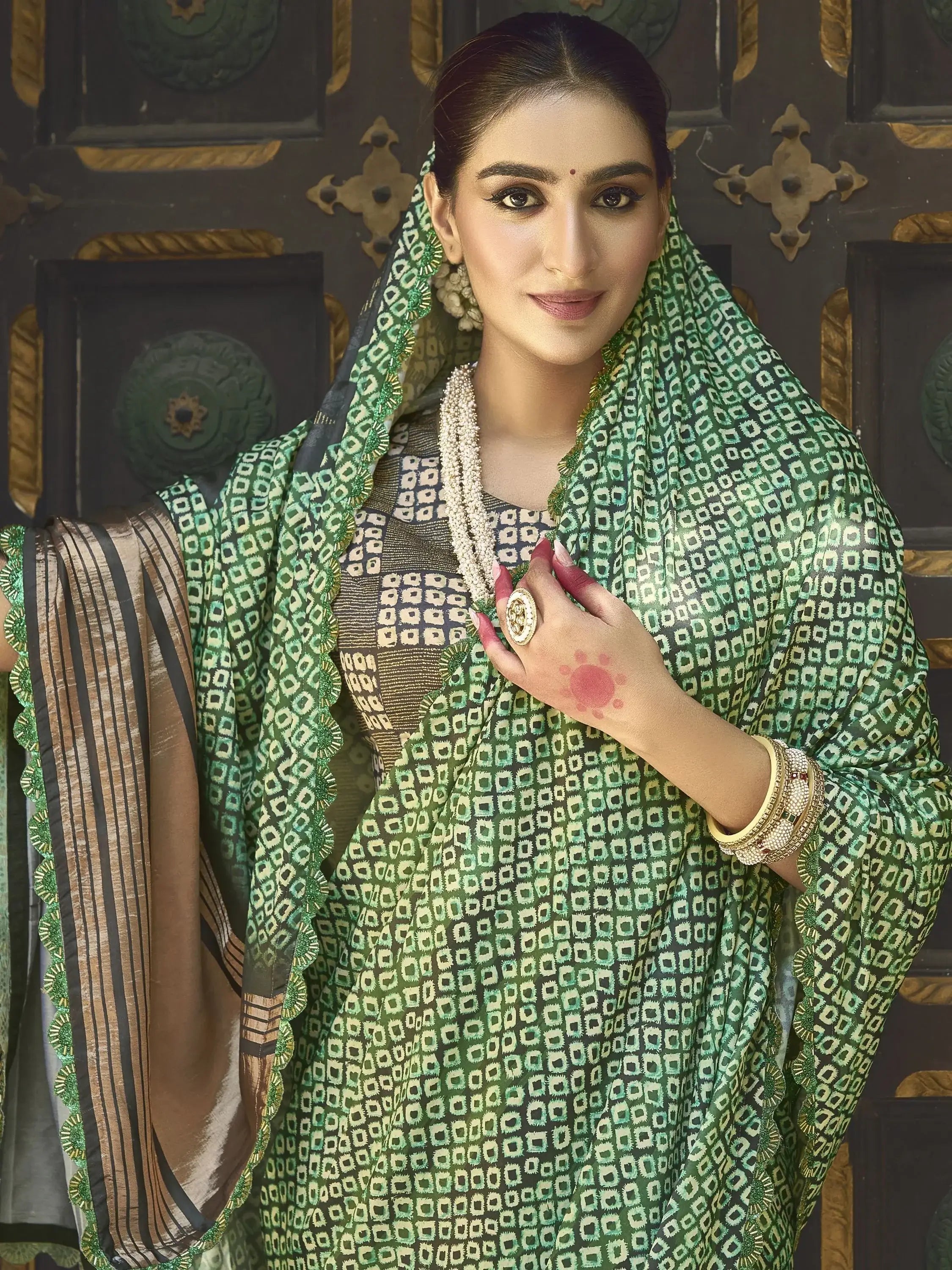 Immerse yourself in elegance with our green color saree, crafted from luxurious gaji silk and designed with intricate digital prints and exquisite beads work. This saree embodies a sophisticated charm, perfect for making a statement at any special event.