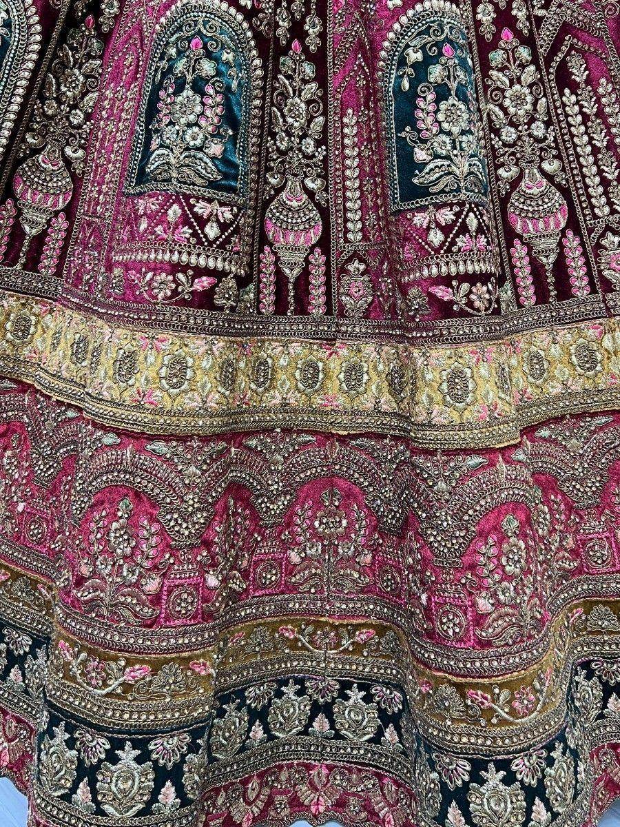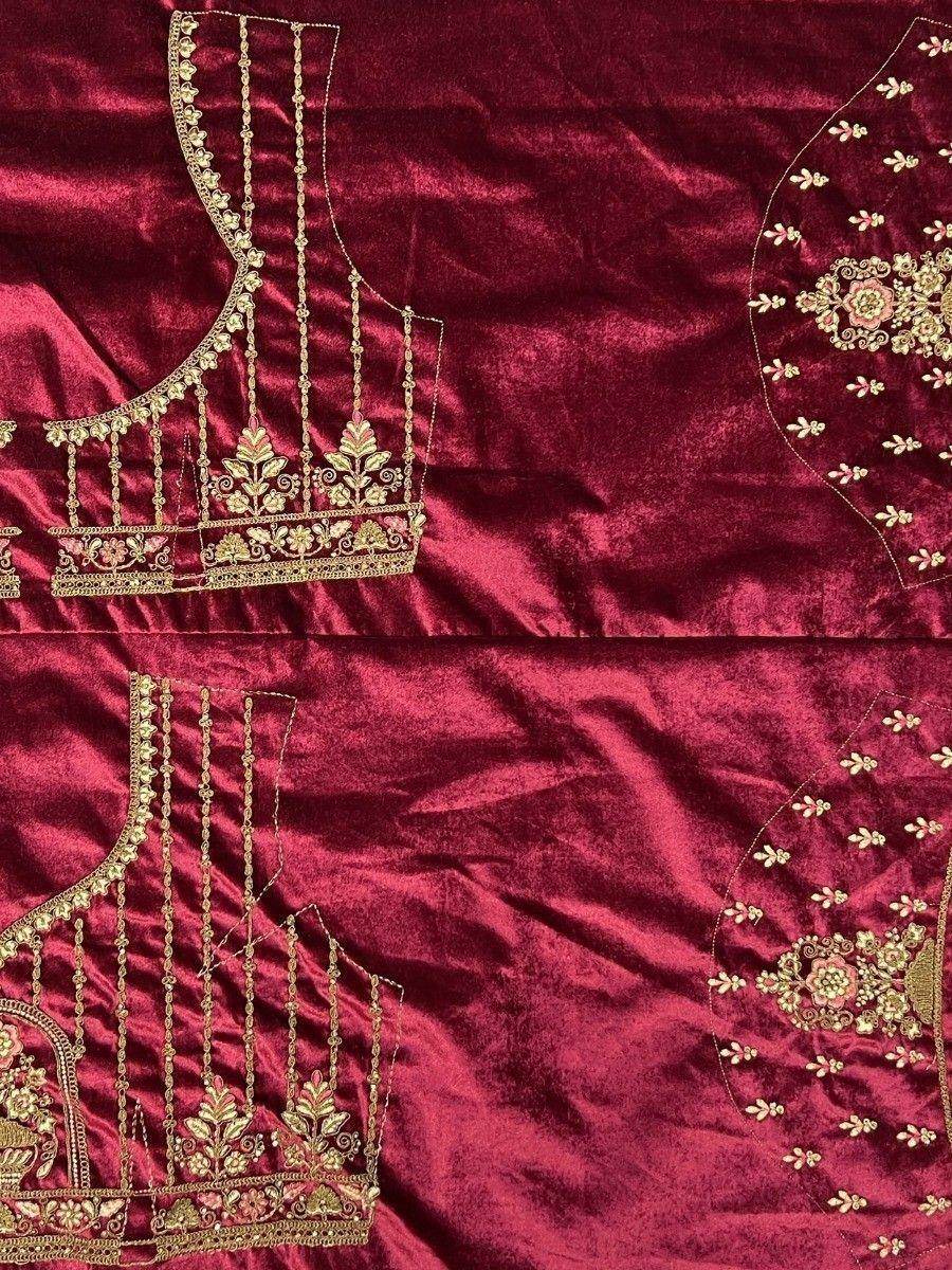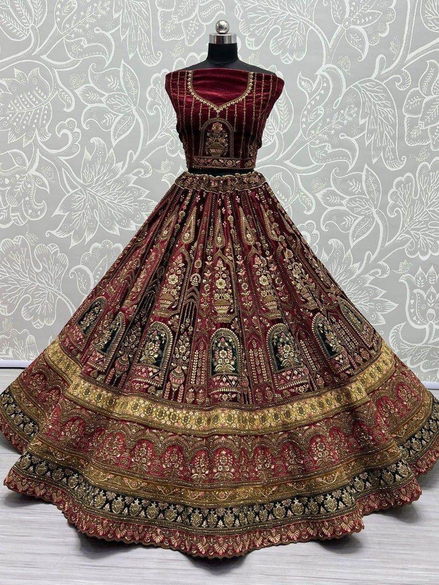 Perfect for weddings and other special occasions, this maroon velvet bridal lehenga choli exudes elegance and grace. The A-line silhouette enhances your figure, while the intricate thread work, lace, sequin work, and thread embroidery create a dazzling effect that will make you the center of attention. The round neck and V-shaped neck add a touch of sophistication to the overall design.