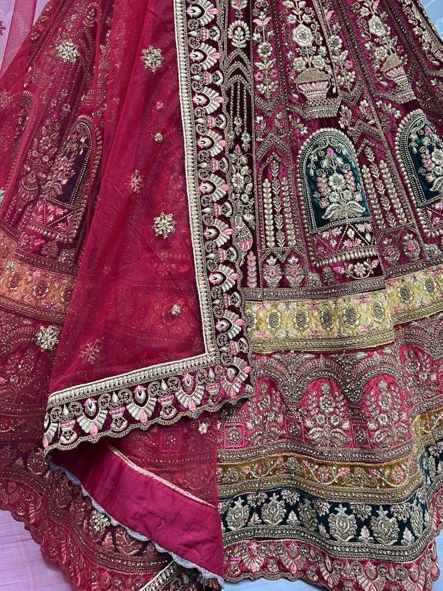 This lovable maroon thread work velvet bridal lehenga choli with dupatta is crafted from the finest quality materials. The lehenga features intricate embroidered work, fancy dori work, multi-thread work, sequin work, and diamond work, all adorning the maroon velvet fabric. The choli, in the same maroon color velvet material as the lehenga, showcases fancy embroidered work, dori work, multi-thread work, and diamond work, adding to the overall allure of the ensemble. The net dupatta, also in a similar maroon shade, is embellished with a four-sided embroidered work and a gorgeous heavy lace borderwork.