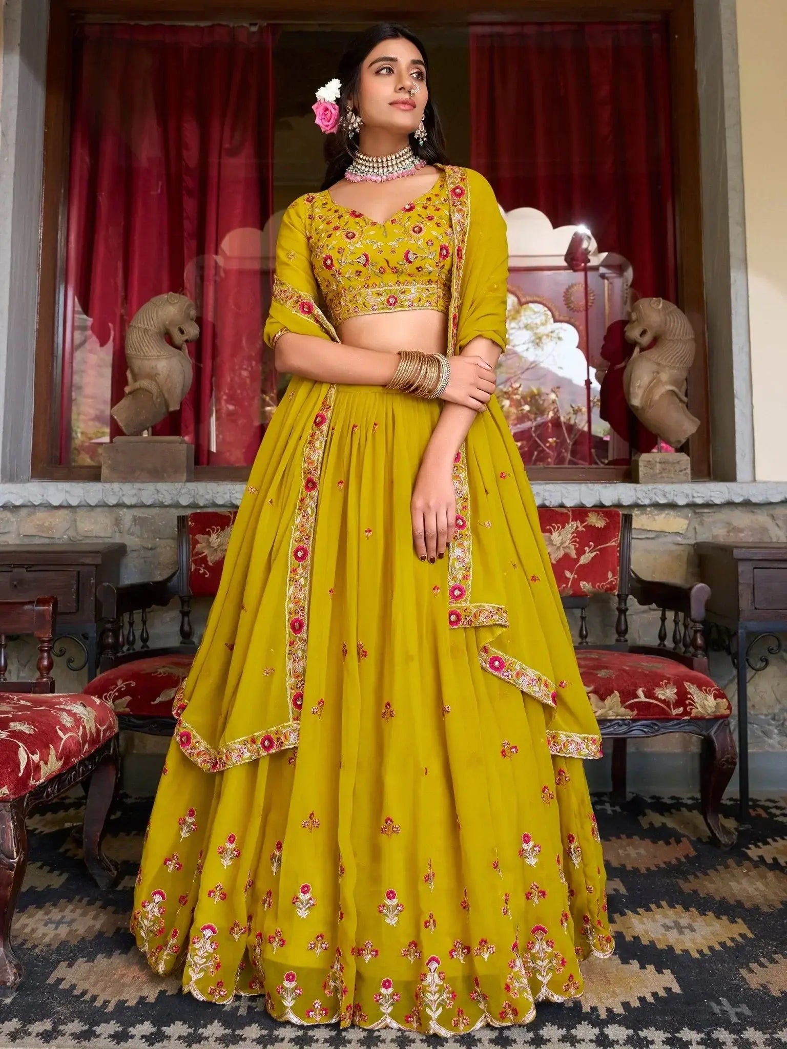 Brighten up your haldi celebration with this lovable mustard yellow georgette stitched lehenga. Designed with sequins and delicate floral thread embroidery, it adds a festive sparkle while maintaining a soft, elegant charm—perfect for pre-wedding rituals.