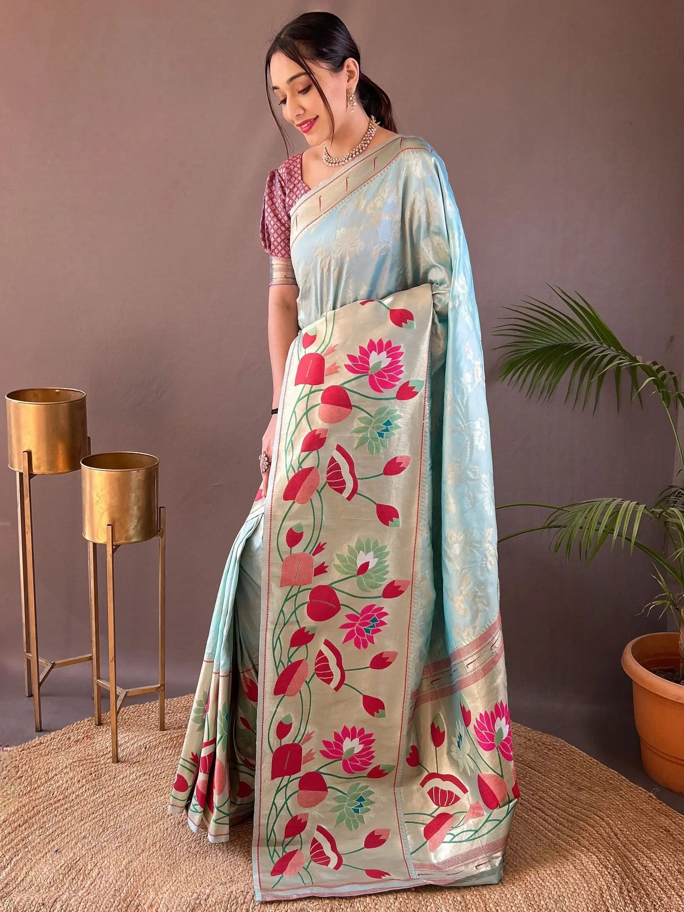Elevate your style with the sky blue paithani silk saree, and make a stunning impression at your next celebration with its timeless elegance and craftsmanship.
