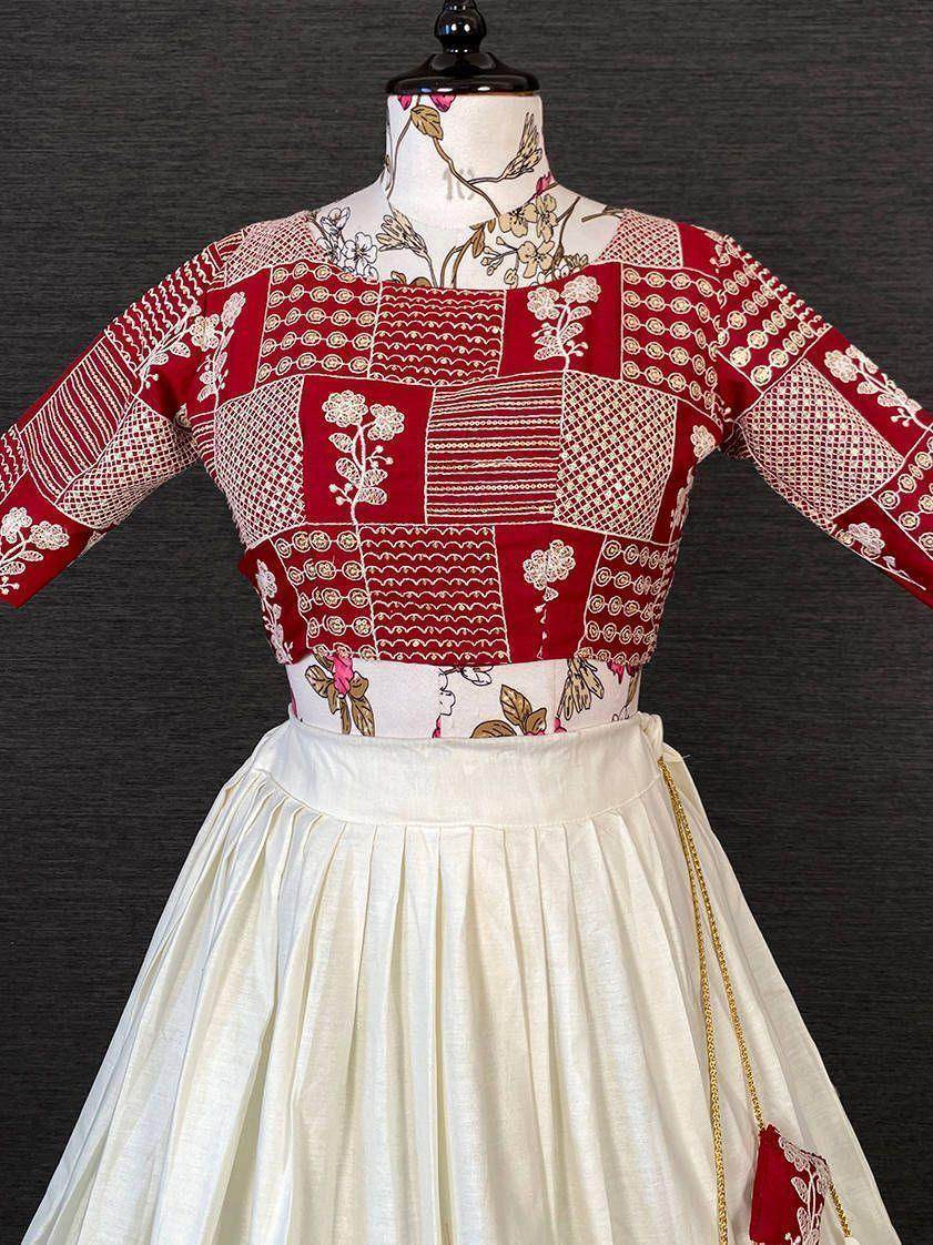 This lehenga comes with red color crop top in pure cotton material with sequins and lucknowi thread embroidery work.