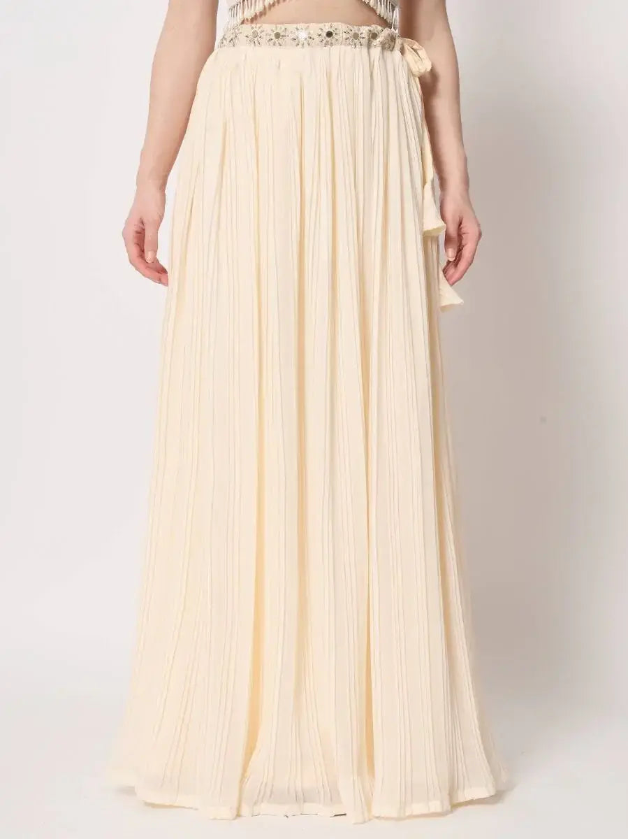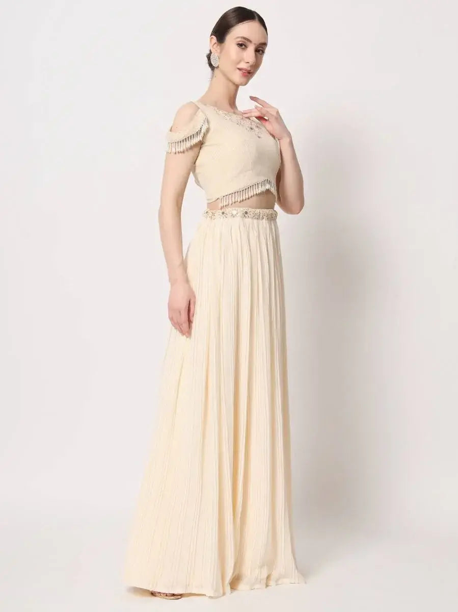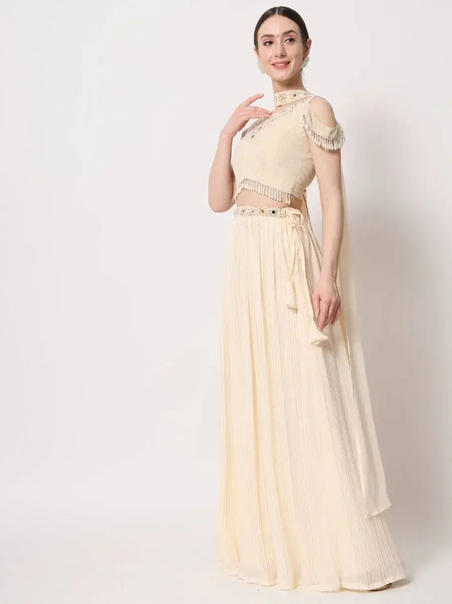 Believe in something beautiful then adorns yourself in a beige hue lehenga crafted on georgette enriched with sequins, and mirrors.