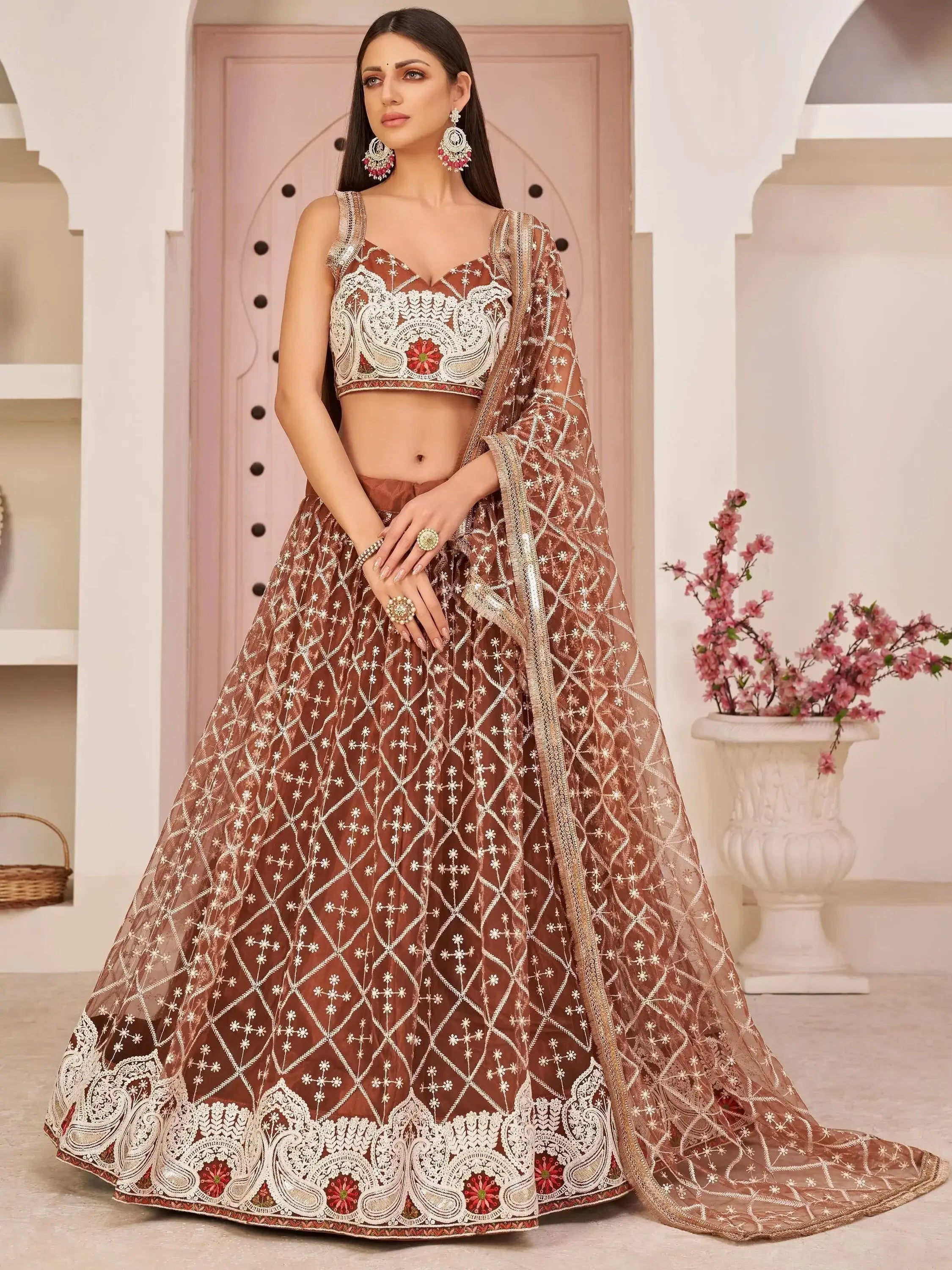 Bring back the traditional charm to your closet with this exceptional brown color lehenga made of mono net material embellished with thread embroidery work.