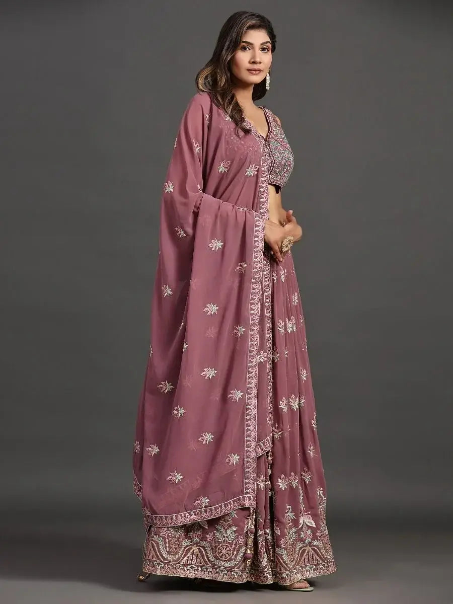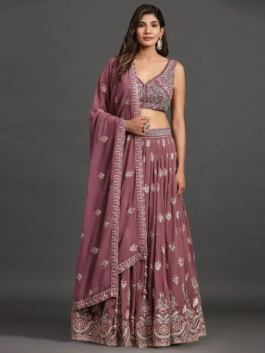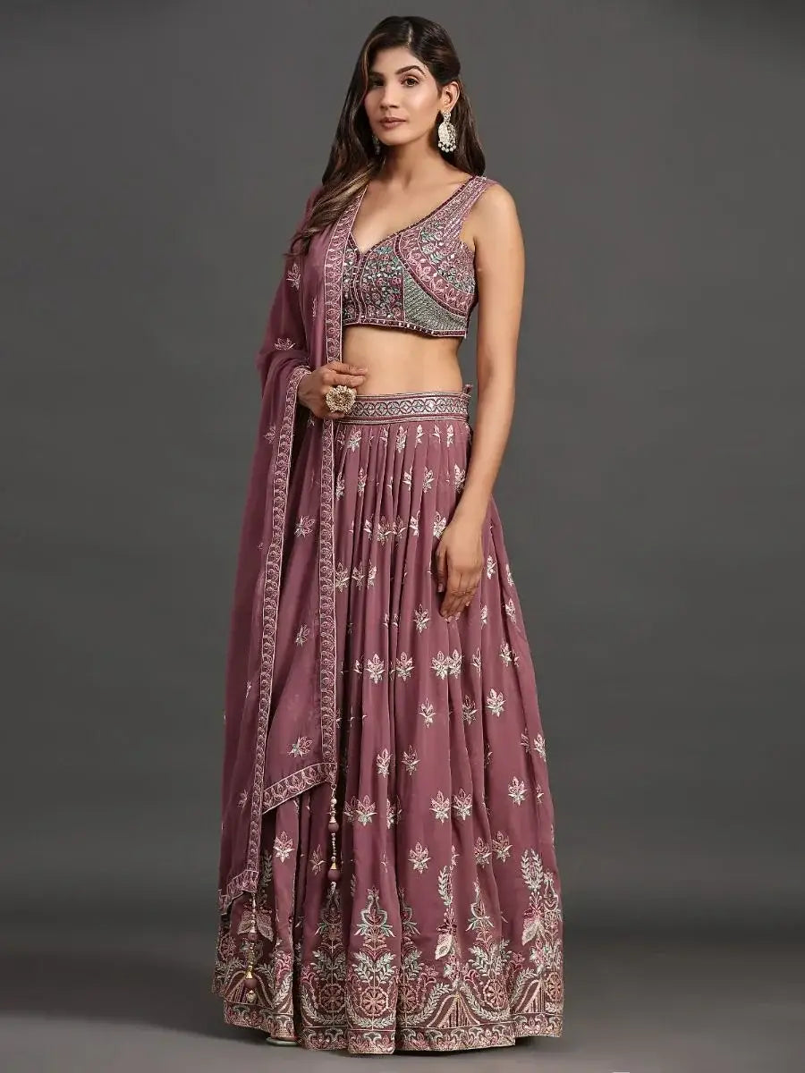 Introducing our lovely lavender embroidered georgette lehenga choli with dupatta, a stunning bridal dress that will transform you into a true vision of beauty on your special day. With its intricate embroidery and traditional design, this lehenga choli exudes elegance and grace.