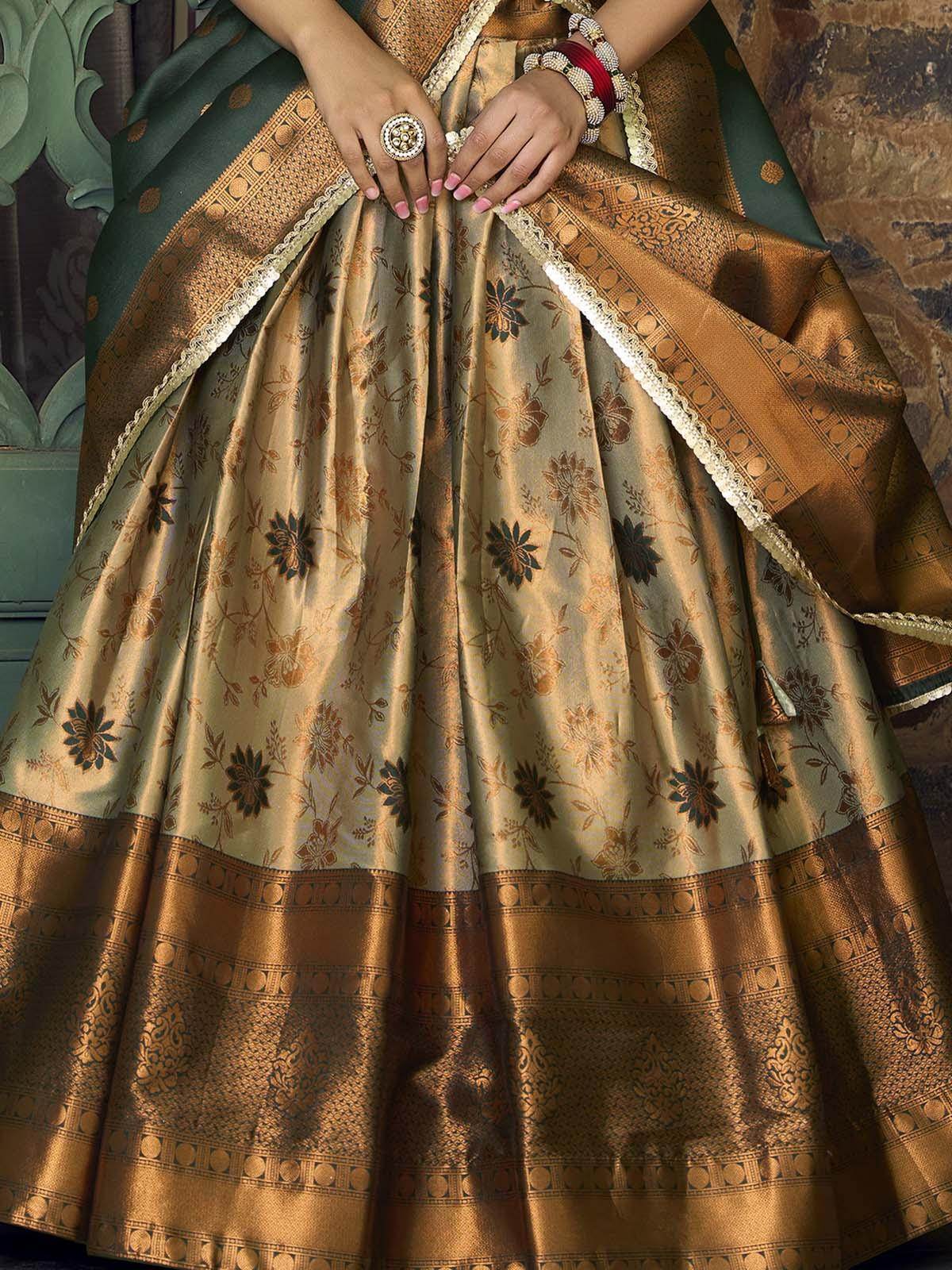 The set includes a brown color jacquard silk choli with matching zari weaving work, as well as a green color jacquard silk dupatta with zari weaving and attractive lace border work. The beautiful belt with zari weaving work adds the perfect finishing touch to this gorgeous outfit.